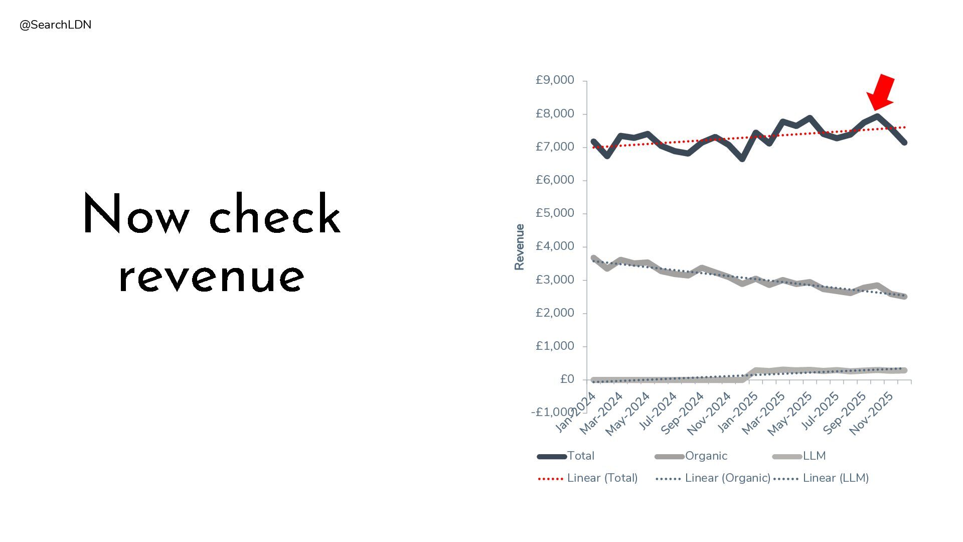 £5,000 £6,000 £7,000 £8,000 £9,000 Revenue Total Organic LLM Linear (Total) Linear (Organic) Linear (LLM)