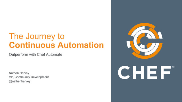Chef is the leader in Continuous Automation software, and one of the founders of the DevOps movement. Nathen Harvey, VP of Community at Chef, will present and demonstrate Chef's capabilities for enabling collaboration and continuous automation across your infrastructure, applications, and compliance for all your apps and infrastructure. Manage everything as code, follow a proven path, and achieve measurable outcomes with Chef.