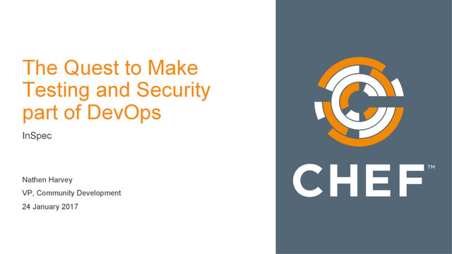 tool. While Ohai’s primary purpose is setting up the context of a chef-client run by discovering and setting system attributes, it can be used in many custom applications. Chef-client includes Ohai data during every run. Chef can take action based on attributes detected and set by Ohai. Test-kitchen is a test harness tool to execute your configuration code on one or more platforms in isolation. It allows you to quickly model and test proposed changes on non-critical systems. All Chef cookbooks should be setup with test-kitchen verifications embedded in them. InSpec is a human- readable language for automated testing and compliance auditing of your entire infrastructure. These tests are useful for verifying that your servers and applications are configured correctly. InSpec tests are extensible with metadata that leverages the compliance features of Chef Automate to assist with continuous compliance reporting. Chef-client & Ohai Test-kitchen InSpec & Chef Automate Workflow • Local development • Integration • Tooling (APIs & SDKs) COLLABORATE ▪ Package ▪ Test BUILD Infrastructure Automation Compliance Automation Application Automation ▪ Secure ▪ Comply MANAGE OSS AUTOMATION ENGINES ▪ Provision ▪ Configure DEPLOY
