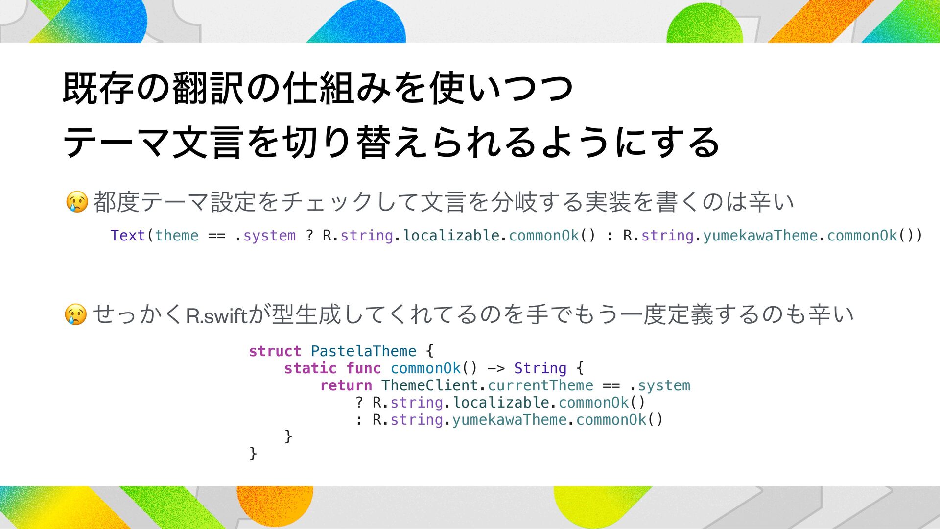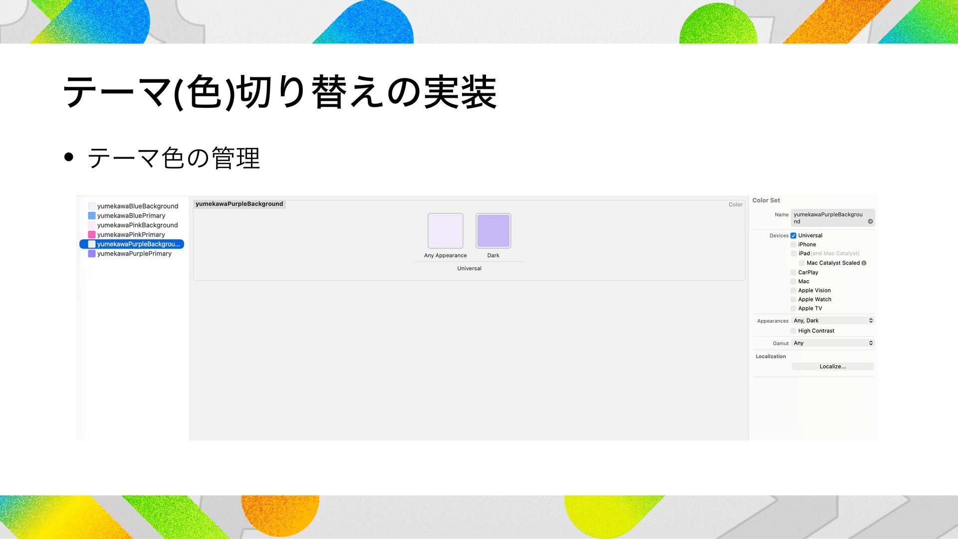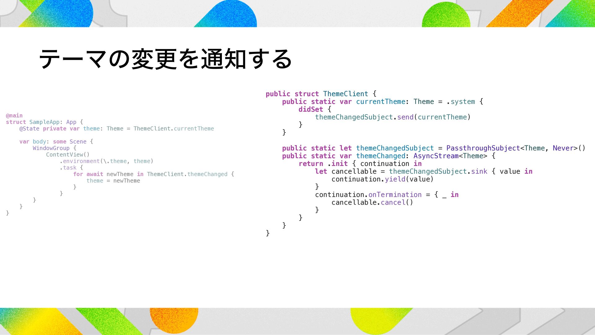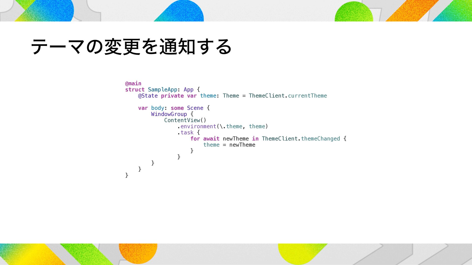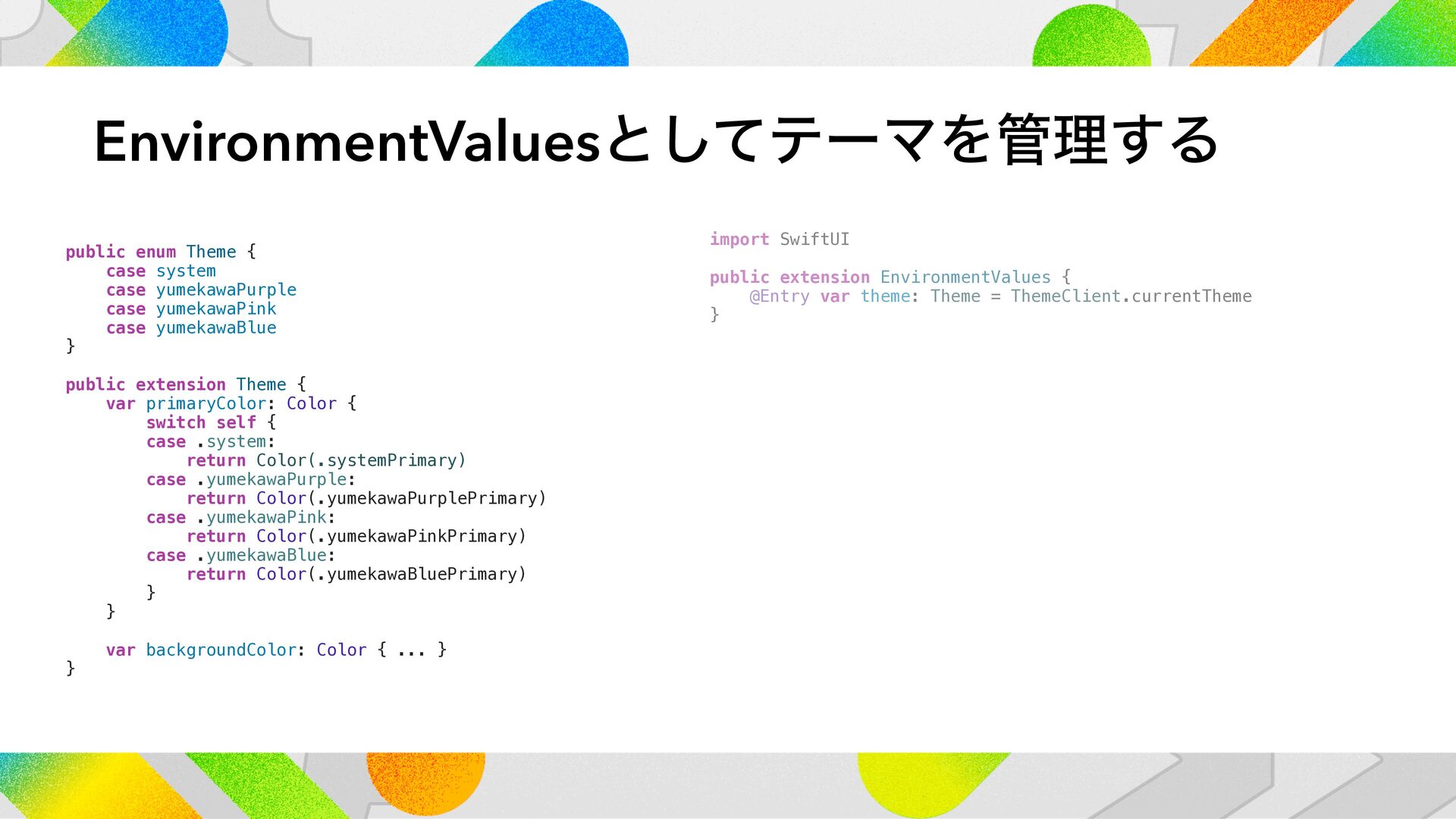 yumekawaPink case yumekawaBlue } public extension Theme { var primaryColor: Color { switch self { case .system: return Color(.systemPrimary) case .yumekawaPurple: return Color(.yumekawaPurplePrimary) case .yumekawaPink: return Color(.yumekawaPinkPrimary) case .yumekawaBlue: return Color(.yumekawaBluePrimary) } } var backgroundColor: Color { ... } } import SwiftUI public extension EnvironmentValues { @Entry var theme: Theme = ThemeClient.currentTheme }