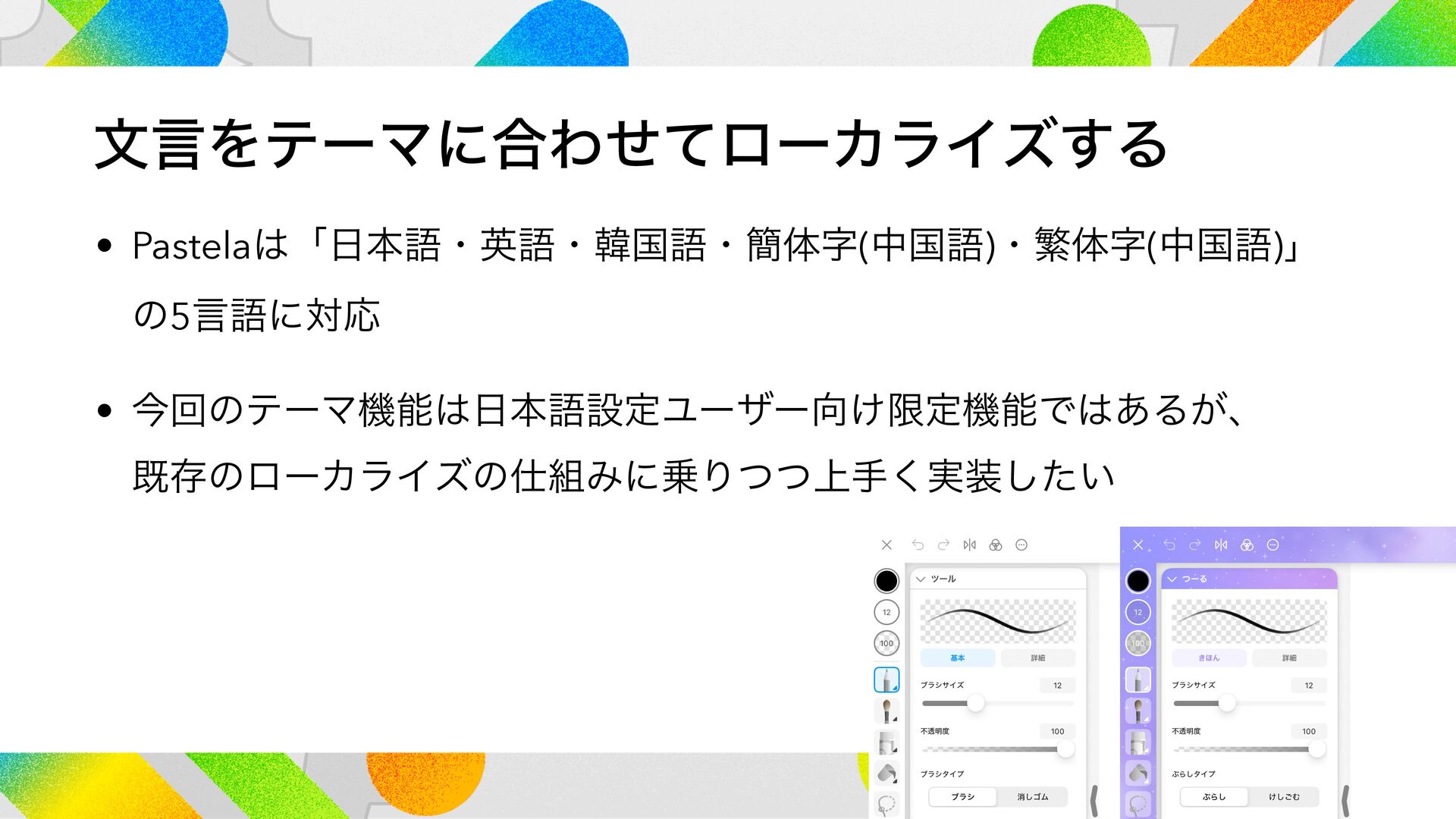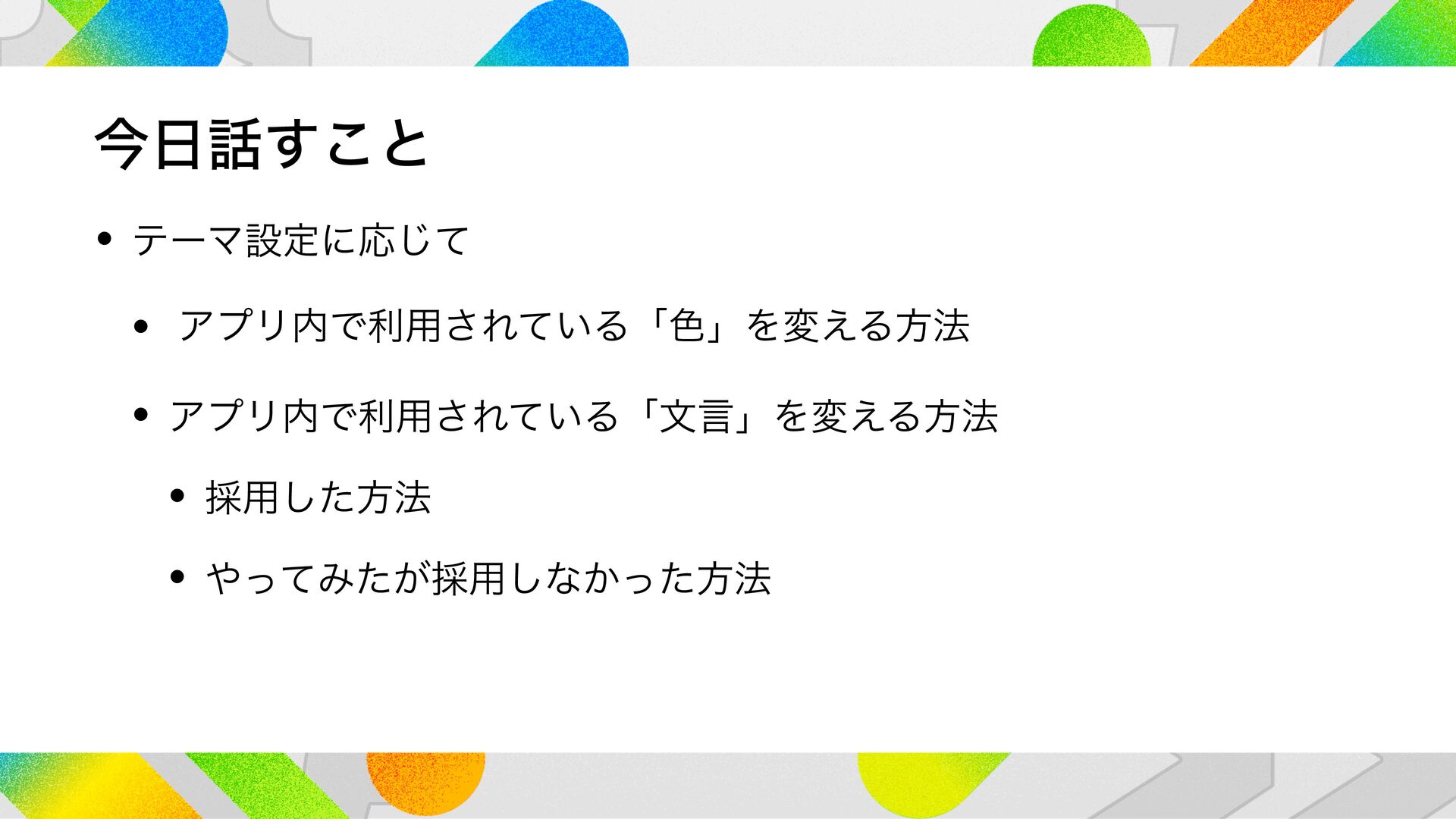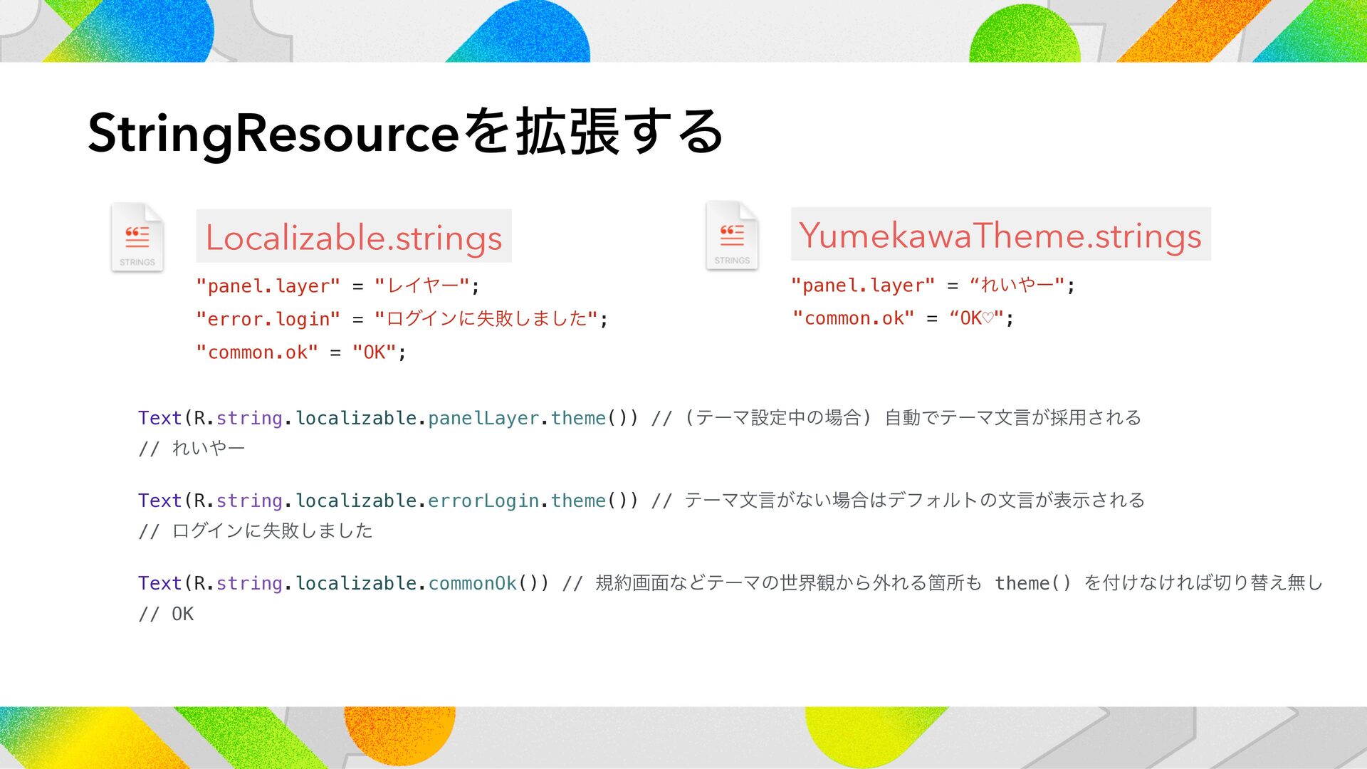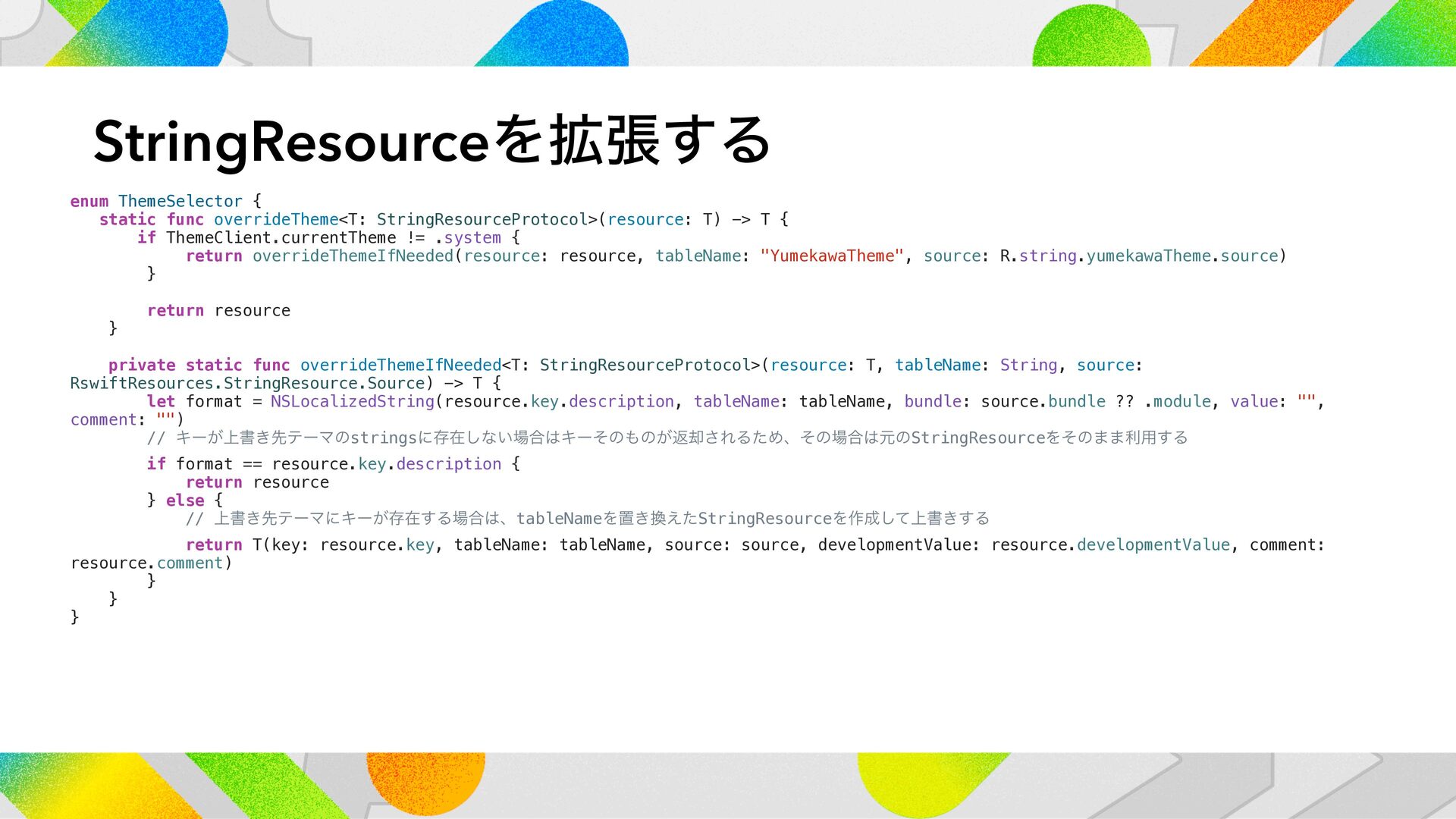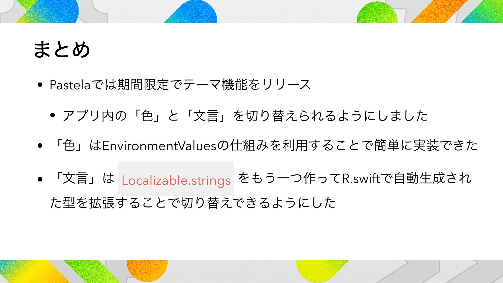 yumekawaPink case yumekawaBlue } public extension Theme { var primaryColor: Color { switch self { case .system: return Color(.systemPrimary) case .yumekawaPurple: return Color(.yumekawaPurplePrimary) case .yumekawaPink: return Color(.yumekawaPinkPrimary) case .yumekawaBlue: return Color(.yumekawaBluePrimary) } } var backgroundColor: Color { ... } } import SwiftUI public extension EnvironmentValues { @Entry var theme: Theme = ThemeClient.currentTheme }
