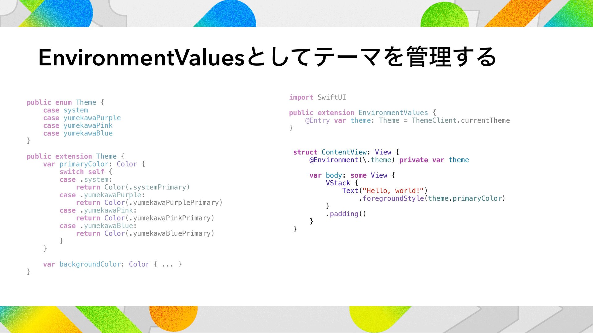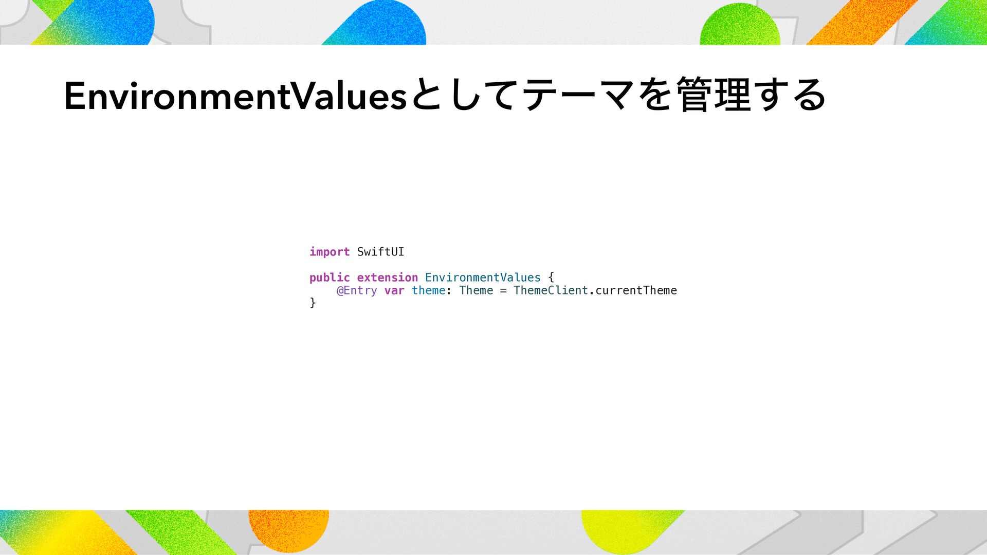 yumekawaPink case yumekawaBlue } public extension Theme { var primaryColor: Color { switch self { case .system: return Color(.systemPrimary) case .yumekawaPurple: return Color(.yumekawaPurplePrimary) case .yumekawaPink: return Color(.yumekawaPinkPrimary) case .yumekawaBlue: return Color(.yumekawaBluePrimary) } } var backgroundColor: Color { ... } } struct ContentView: View { @Environment(\.theme) private var theme var body: some View { VStack { Text("Hello, world!") .foregroundStyle(theme.primaryColor) } .padding() } } import SwiftUI public extension EnvironmentValues { @Entry var theme: Theme = ThemeClient.currentTheme }