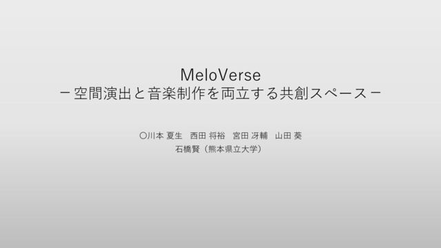 MeloVerseを通して,音楽制作未経験者でも空間演出を楽しみながら,コライトによる音楽制作を実現し,新たなメタバースコンテンツの体験を提供する