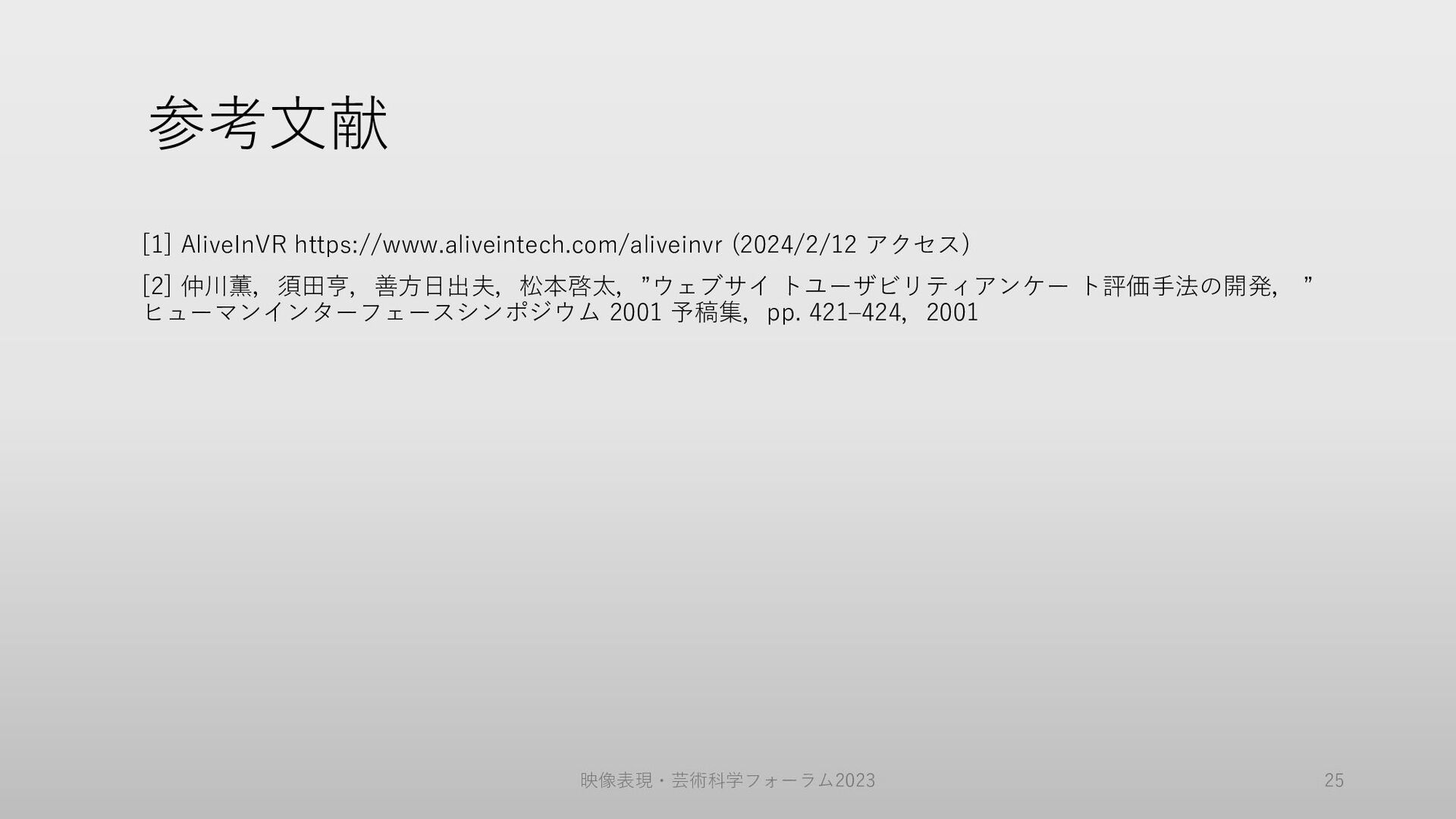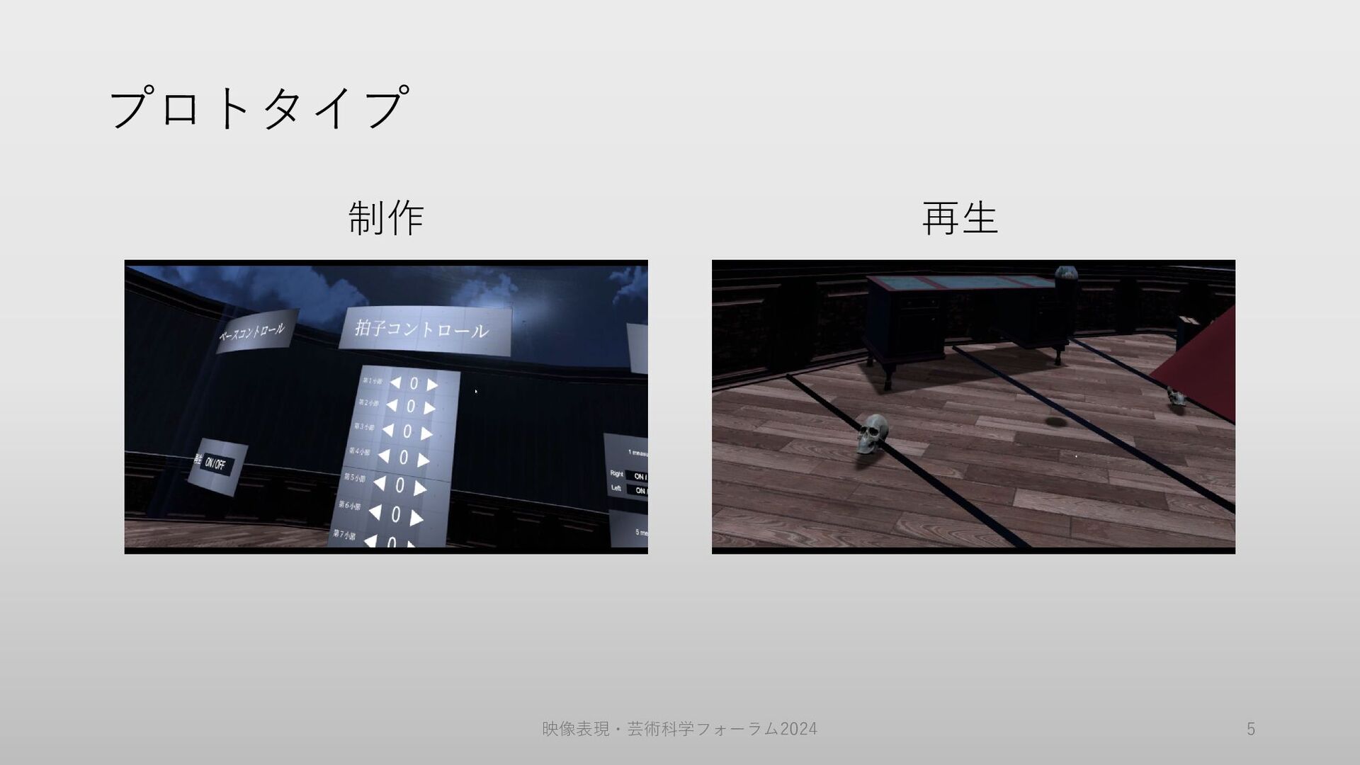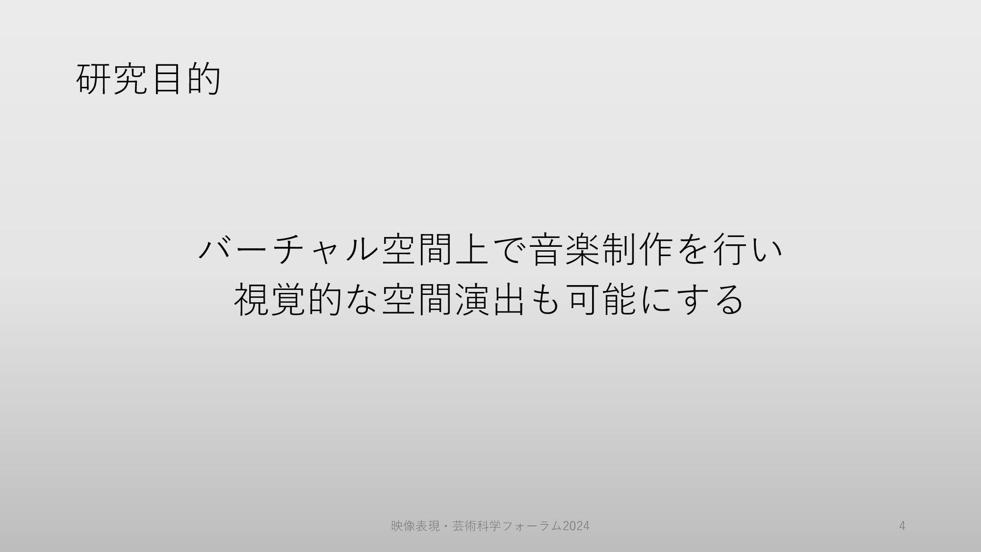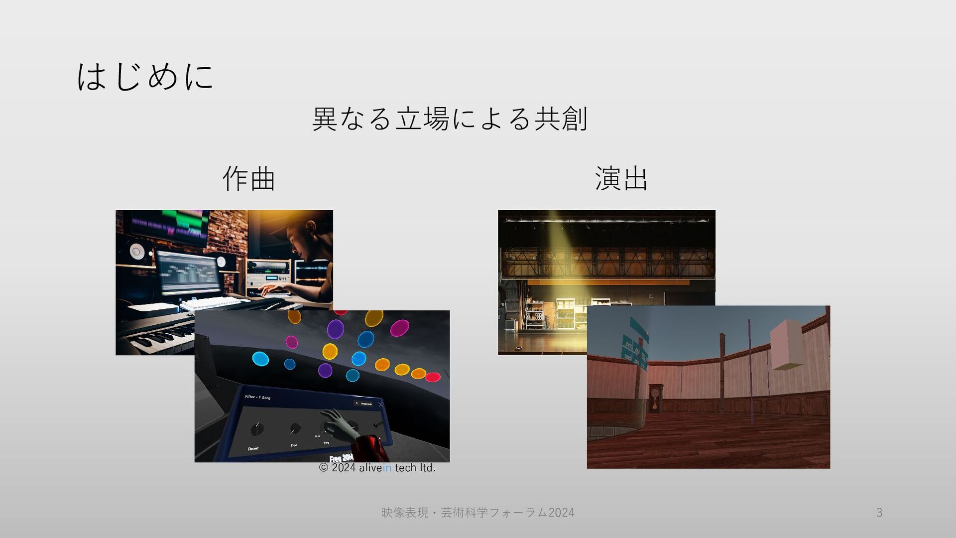 他方では,バーチャルリアリティ(VR)の概念も,各種メディアを通じて一般に認識されている.音楽制作の分野では,前述のツールの普及もあり,バーチャル空間での音楽制作ツールAliveInVRも開発されている.