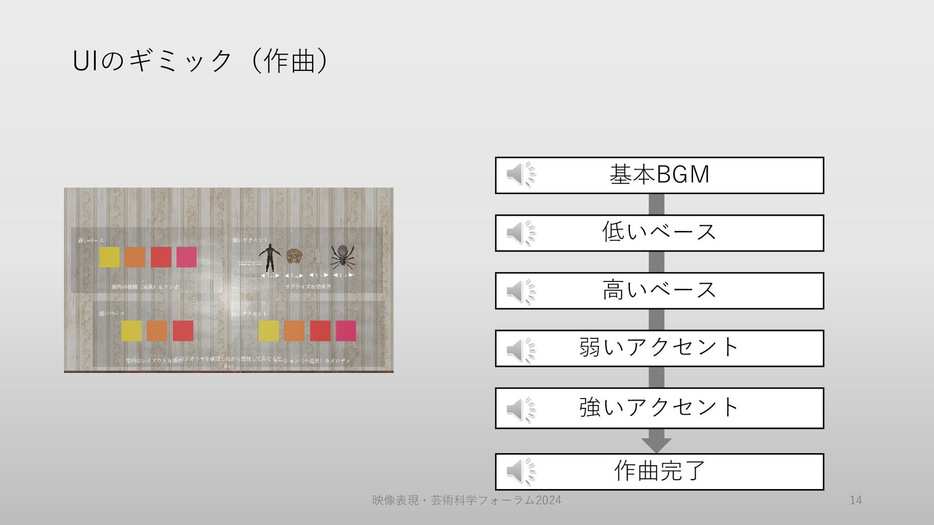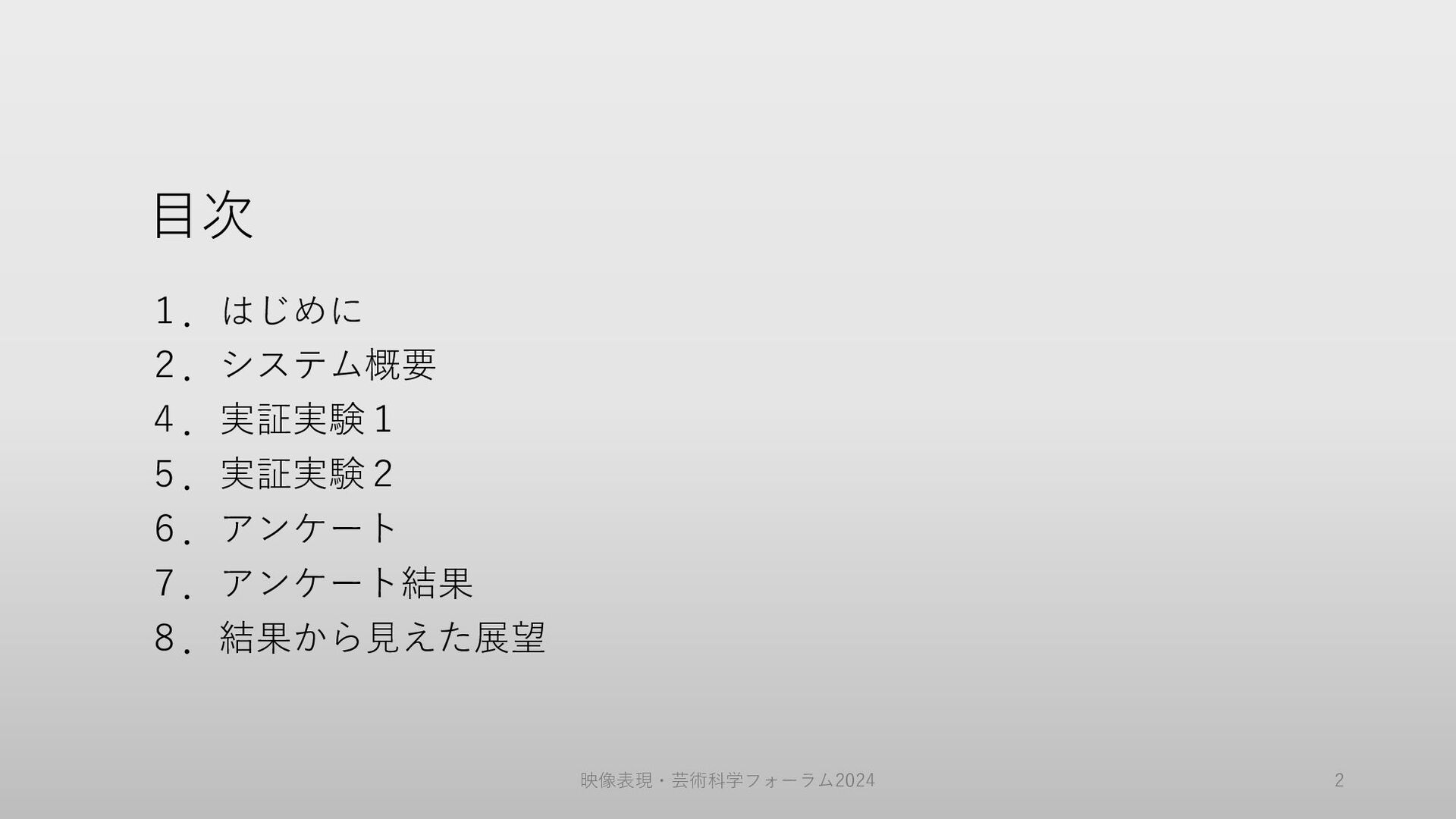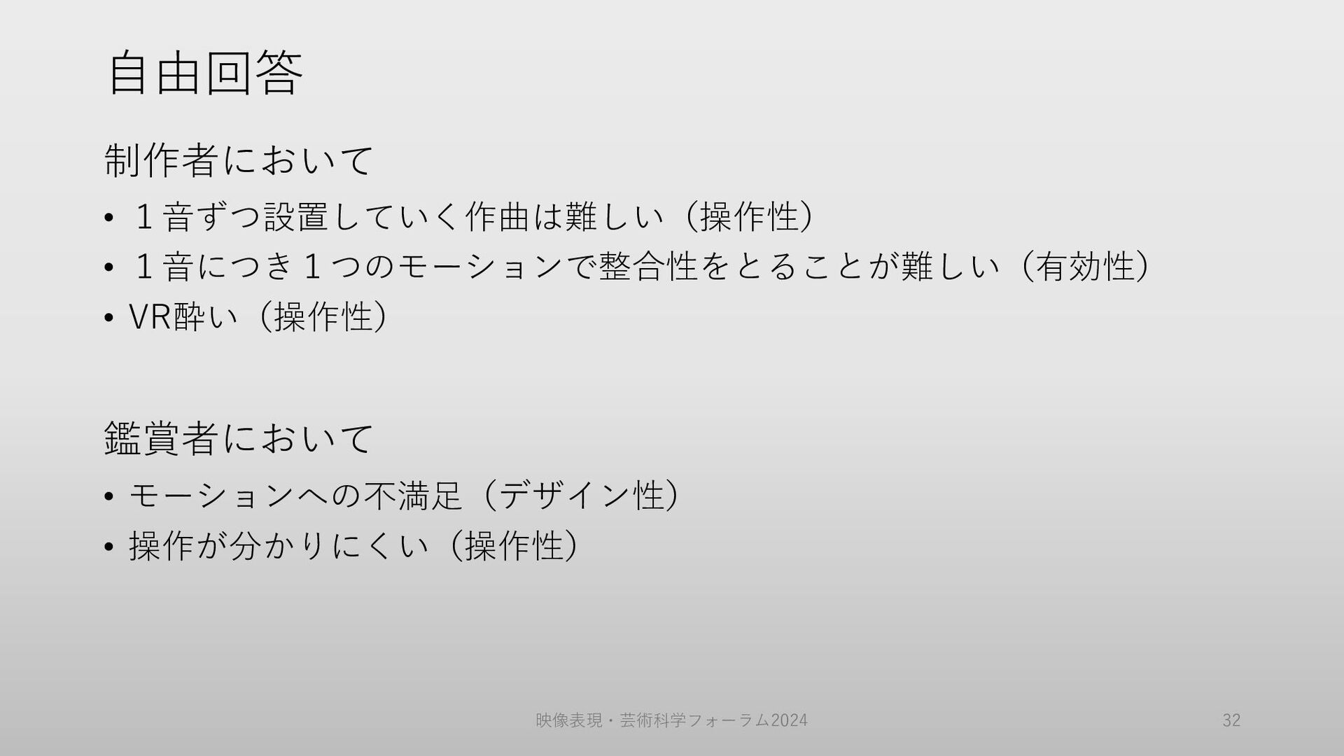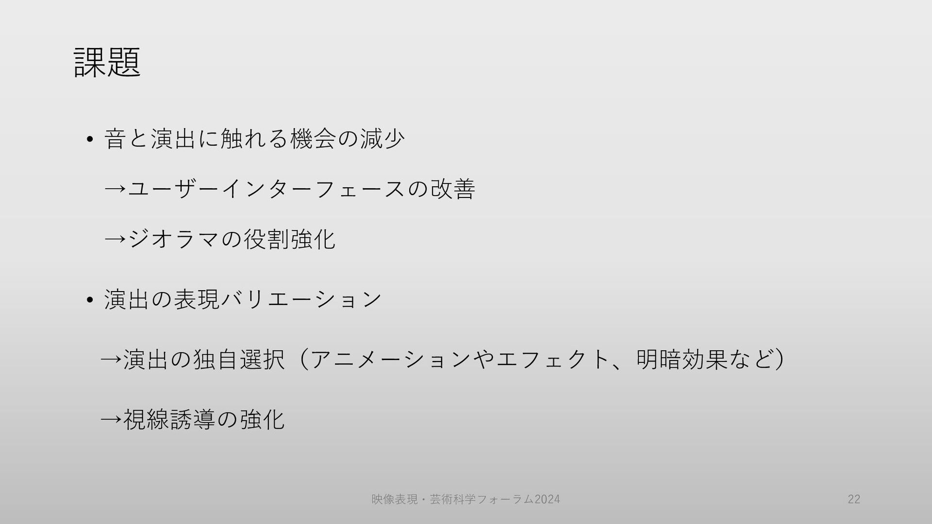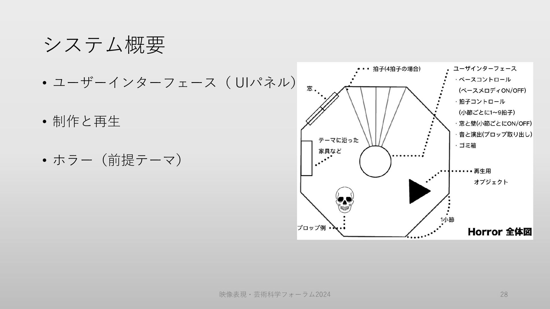 他方では,バーチャルリアリティ(VR)の概念も,各種メディアを通じて一般に認識されている.音楽制作の分野では,前述のツールの普及もあり,バーチャル空間での音楽制作ツールAliveInVRも開発されている.