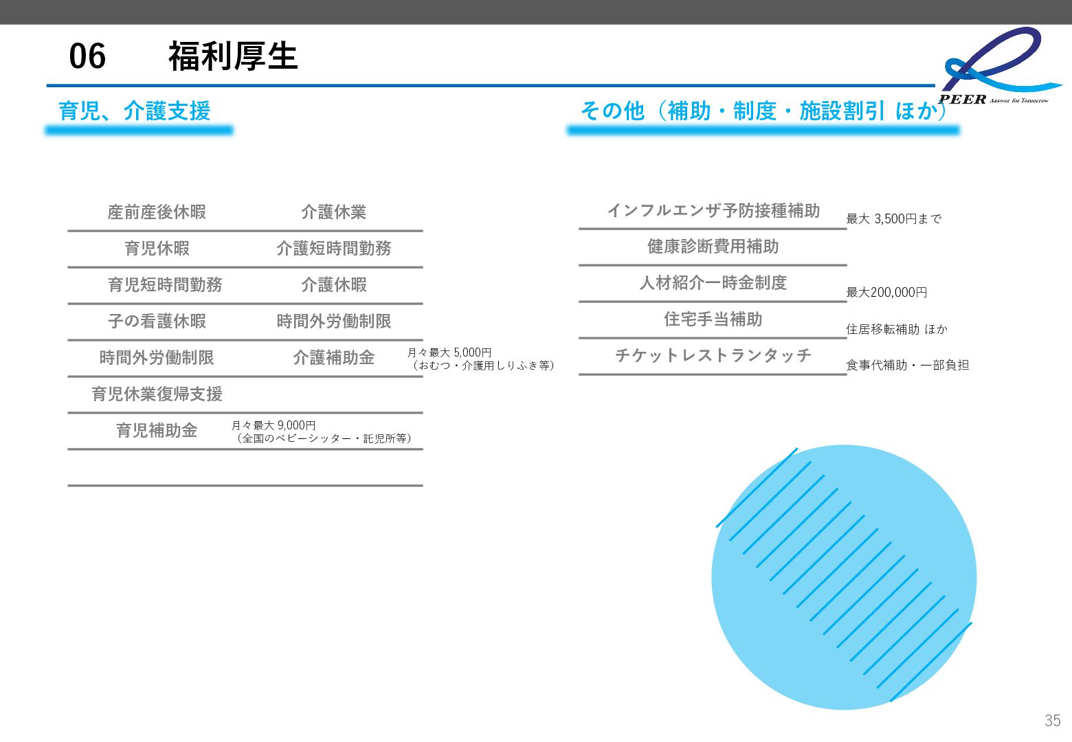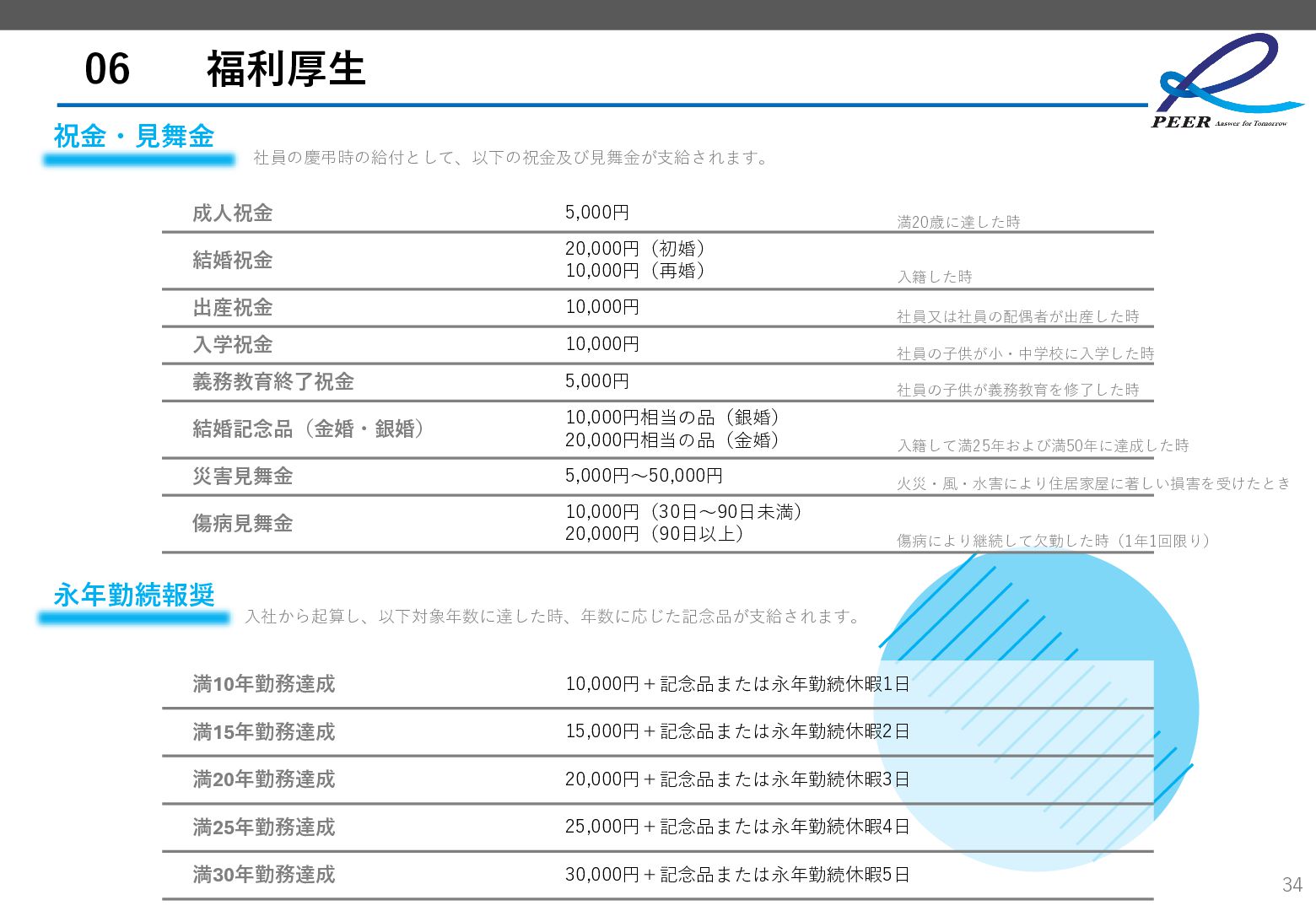 10,000円 義務教育終了祝金 5,000円 結婚記念品(金婚・銀婚) 10,000円相当の品(銀婚) 20,000円相当の品(金婚) 災害見舞金 5,000円~50,000円 傷病見舞金 10,000円(30日~90日未満) 20,000円(90日以上) 34 祝金・見舞金 社員の慶弔時の給付として、以下の祝金及び見舞金が支給されます。 永年勤続報奨 入社から起算し、以下対象年数に達した時、年数に応じた記念品が支給されます。 満10年勤務達成 10,000円+記念品または永年勤続休暇1日 満15年勤務達成 15,000円+記念品または永年勤続休暇2日 満20年勤務達成 20,000円+記念品または永年勤続休暇3日 満25年勤務達成 25,000円+記念品または永年勤続休暇4日 満30年勤務達成 30,000円+記念品または永年勤続休暇5日 満20歳に達した時 入籍した時 社員又は社員の配偶者が出産した時 社員の子供が小・中学校に入学した時 社員の子供が義務教育を修了した時 入籍して満25年および満50年に達成した時 火災・風・水害により住居家屋に著しい損害を受けたとき 傷病により継続して欠勤した時(1年1回限り)