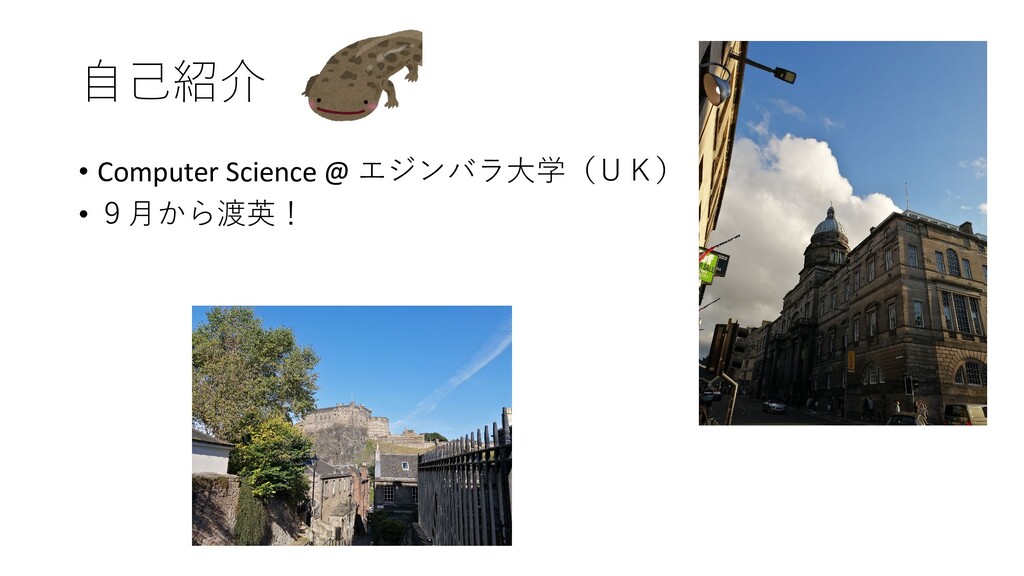 自己紹介 • Computer Science @ エジンバラ大学(UK) • 9月から渡英!