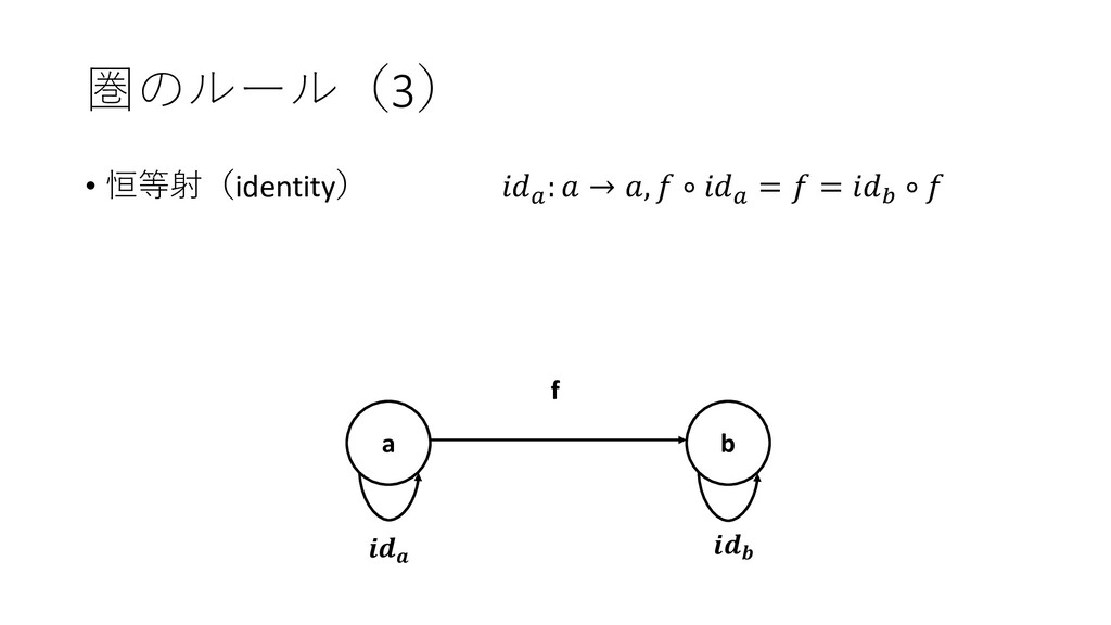 圏のルール(3) • 恒等射(identity) 𝑖𝑖𝑖𝑖𝑎𝑎 : 𝑎𝑎 → 𝑎𝑎, 𝑓𝑓 ∘