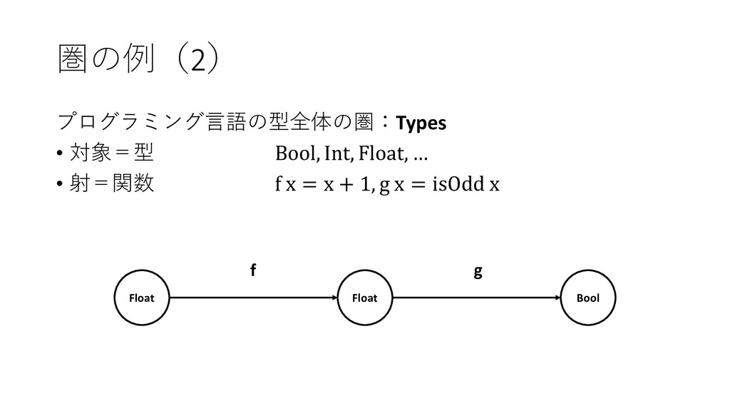 圏の例(2) プログラミング言語の型全体の圏:Types • 対象=型 Bool, Int, Float, … • 射=関数