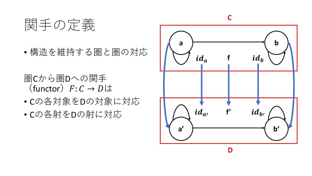 𝐹𝐹 𝑔𝑔 ∘ 𝑓𝑓 = 𝐹𝐹(𝑔𝑔) ∘ 𝐹𝐹(𝑓𝑓) • 𝐹𝐹 𝑖𝑖𝑖𝑖𝑎𝑎 = 𝑖𝑖𝑖𝑖𝐹𝐹(𝑎𝑎) 準同型みたい!! a b f 𝒊𝒊𝒊𝒊𝒂𝒂 𝒊𝒊𝒊𝒊𝒃𝒃 a’ b’ f’ 𝒊𝒊𝒊𝒊𝒂𝒂𝒂 𝒊𝒊𝒊𝒊𝒃𝒃𝒃 C D
