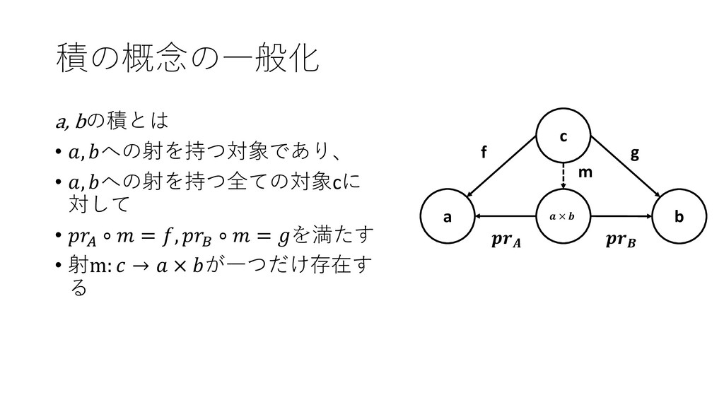 積の概念の一般化 a, bの積とは • 𝑎𝑎, 𝑏𝑏への射を持つ対象であり、 • 𝑎𝑎, 𝑏𝑏への射を持つ全ての対象cに 対して