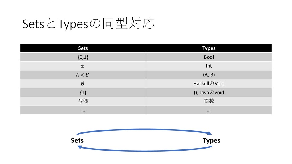 SetsとTypesの同型対応 Sets Types {0,1} Bool 𝕫𝕫 Int 𝐴𝐴 × 𝐵𝐵