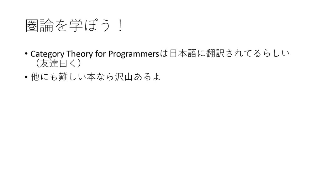 圏論を学ぼう! • Category Theory for Programmersは日本語に翻訳されてるらしい (友達曰く) • 他にも難しい本なら沢山あるよ