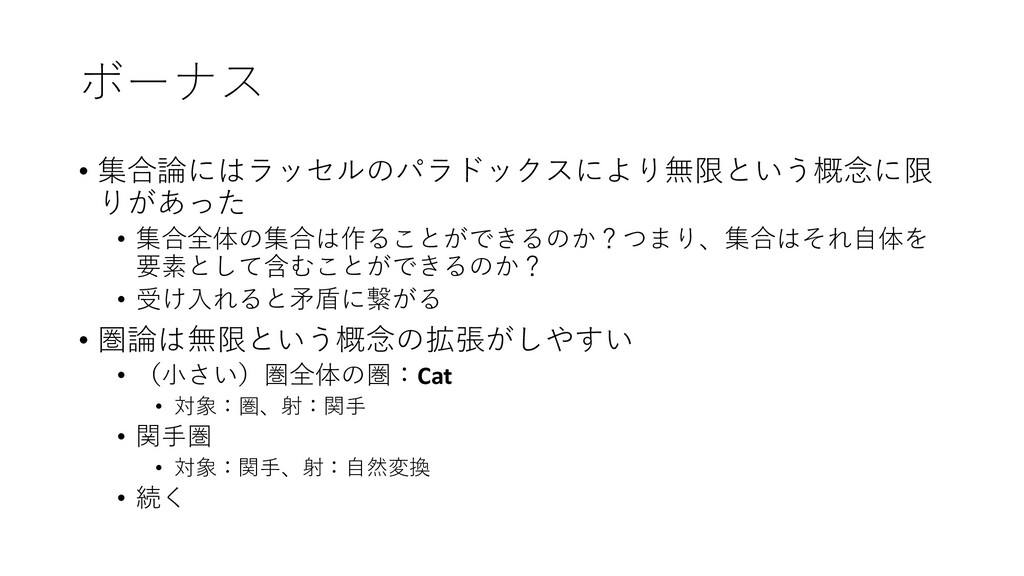 圏論は無限という概念の拡張がしやすい • (小さい)圏全体の圏:Cat • 対象:圏、射:関手 • 関手圏 • 対象:関手、射:自然変換 • 続く