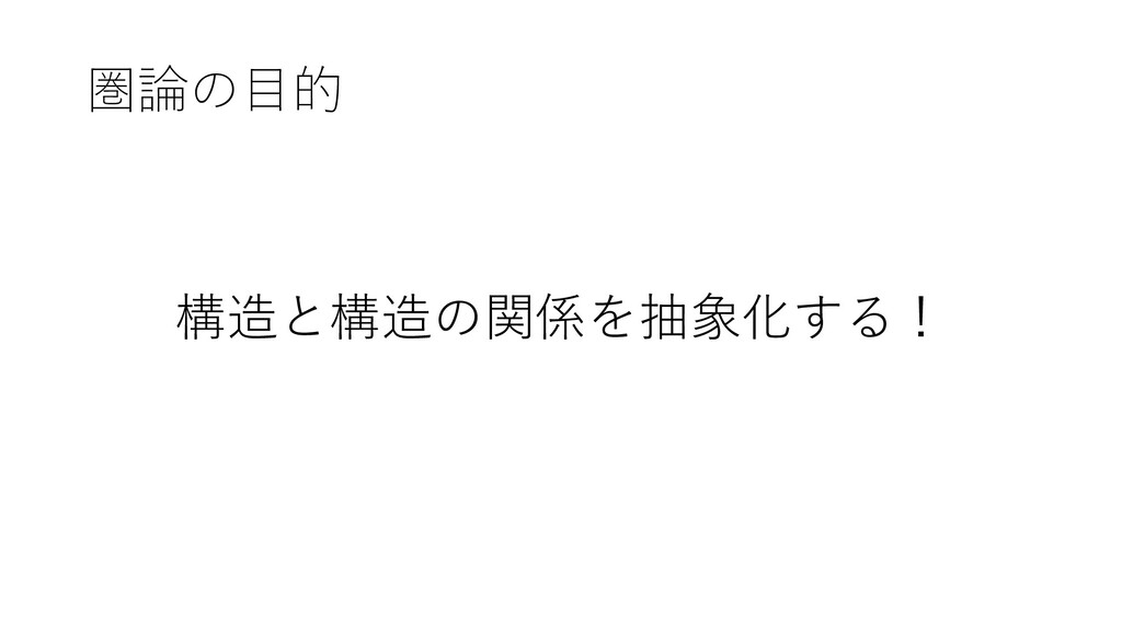他の抽象的構造との比較 • 群、位相空間なども物事を一般化した構造 • 圏はもっと包括的 • 例:群は圏でもある • 対象:適当に1つ定める、射:台集合の要素、合成:二項演算 •
