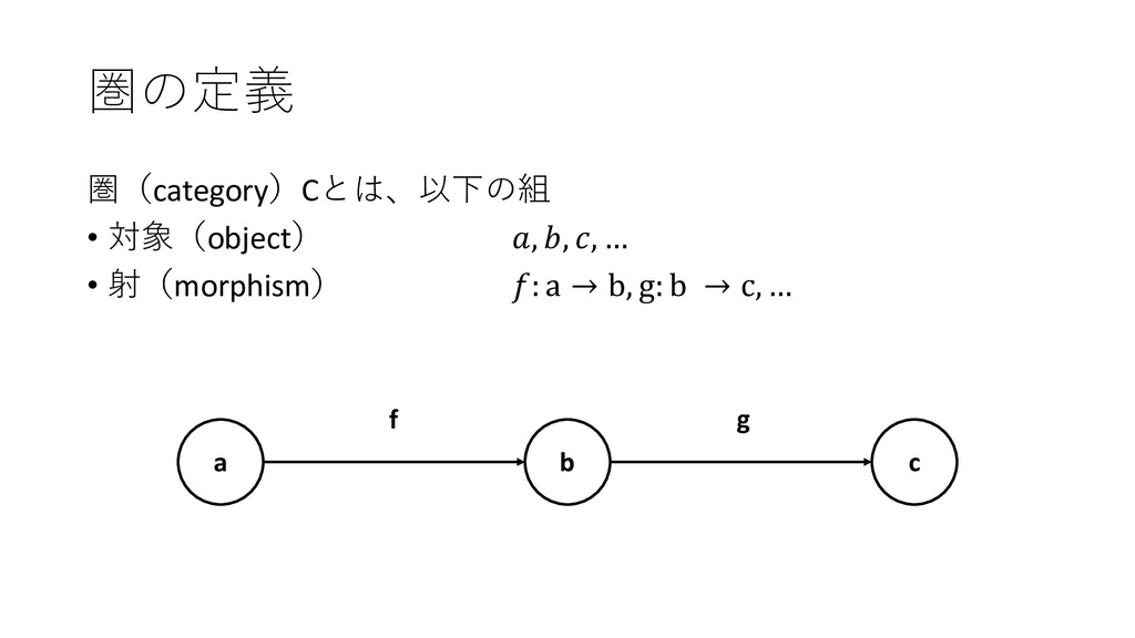圏の定義 圏(category)Cとは、以下の組 • 対象(object) 𝑎𝑎, 𝑏𝑏, 𝑐𝑐, … • 射(morphism)