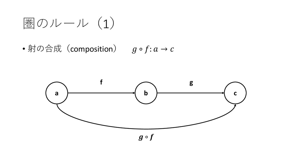 圏のルール(1) • 射の合成(composition) 𝑔𝑔 ∘ 𝑓𝑓: 𝑎𝑎 → 𝑐𝑐 a