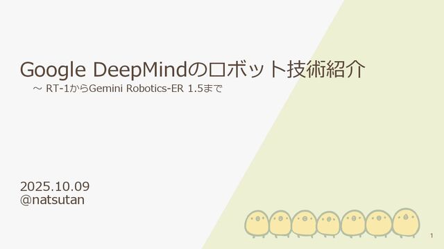 Google DeepMindのロボット技術紹介 ~ RT-1からGemini Robotics-ER 1.5まで 2025.10.09 @natsutan 1