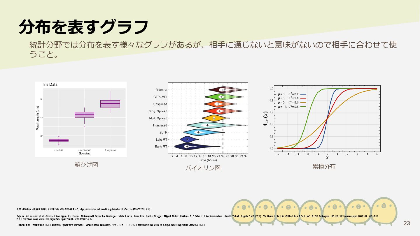 4.0, https://commons.wikimedia.org/w/index.php?curid=47945078による Pejman Mohammadi et al. - Cropped from figure 1 in Pejman Mohammadi, Sébastien Desfarges, István Bartha, Beda Joos, Nadine Zangger, Miguel Muñoz, Huldrych F. Günthard, Niko Beerenwinkel, Amalio Telenti, Angela Ciuffi (2013). "24 Hours in the Life of HIV-1 in a T Cell Line". PLOS Pathogens. DOI:10.1371/journal.ppat.1003161., CC 表示 2.5, https://commons.wikimedia.org/w/index.php?curid=47033698による Inductiveload - 投稿者自身による著作物 (Original text: self-made, Mathematica, Inkscape), パブリック・ドメイン, https://commons.wikimedia.org/w/index.php?curid=3817960による 箱ひげ図 バイオリン図 累積分布