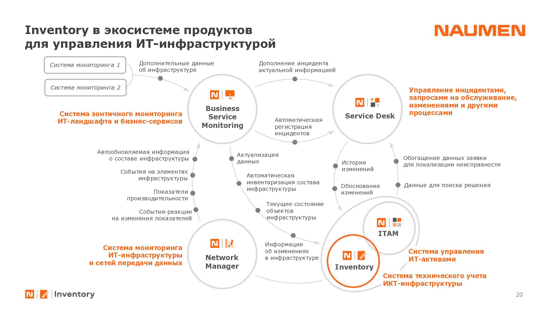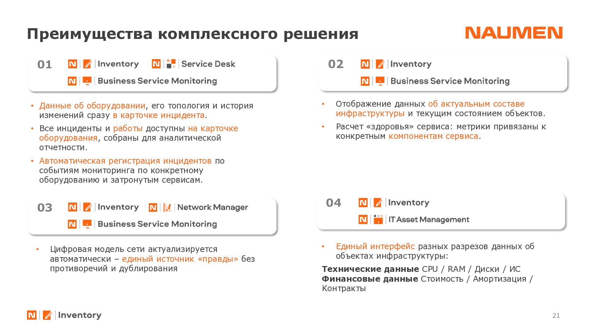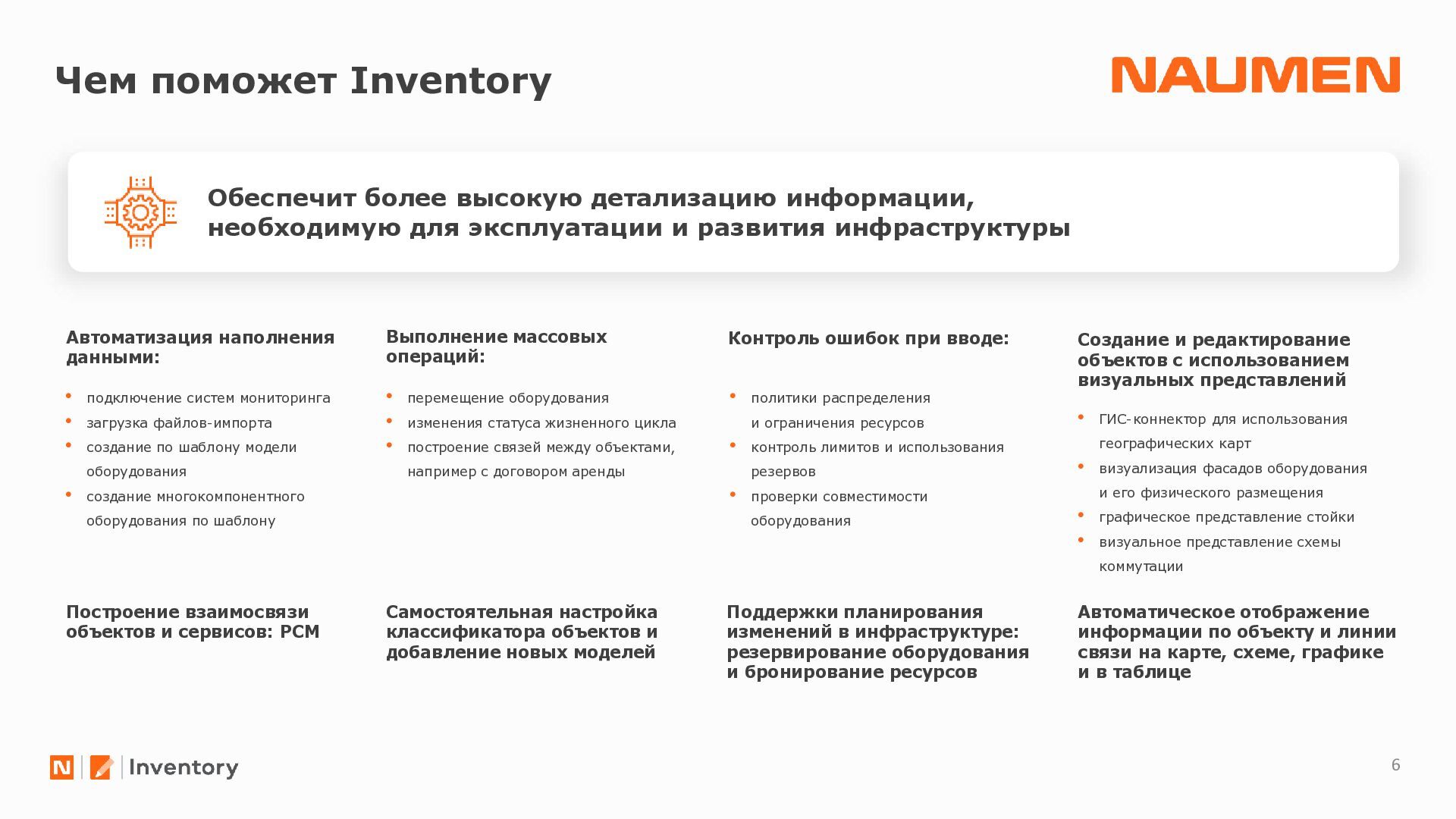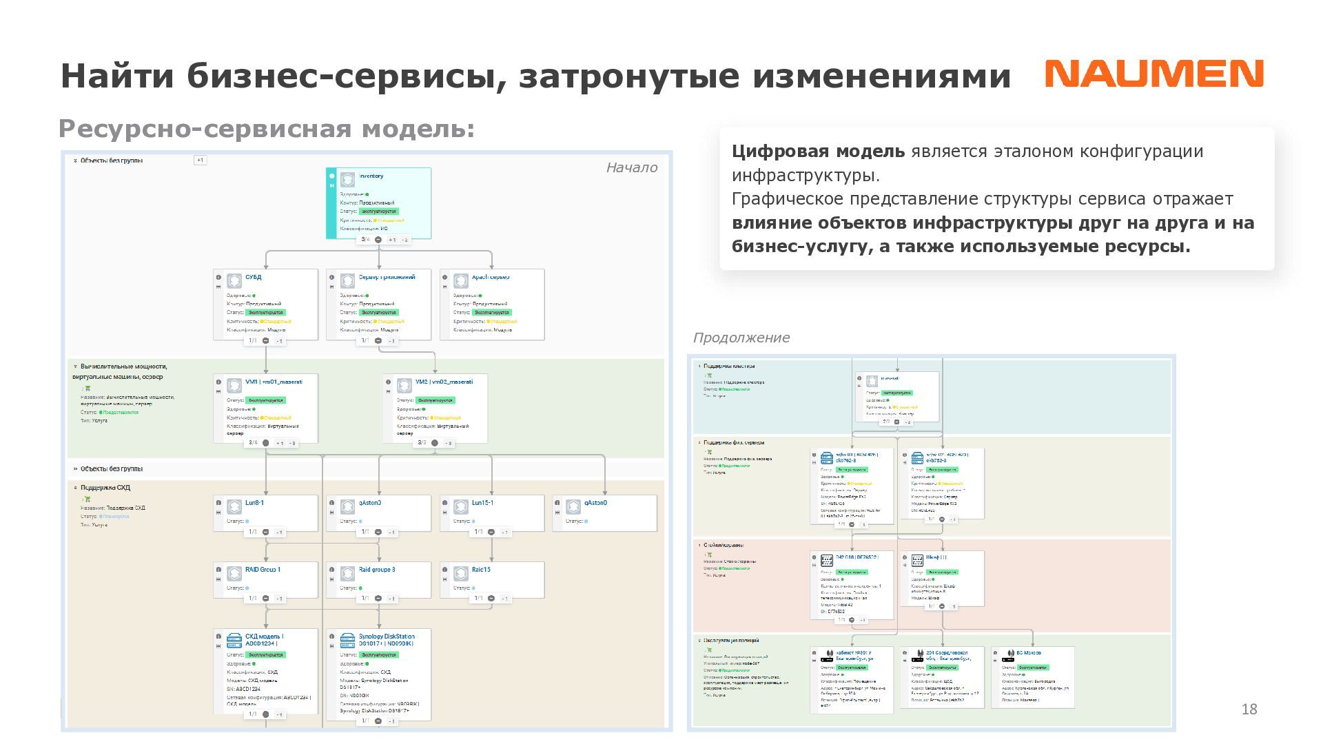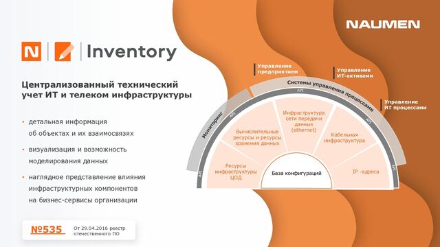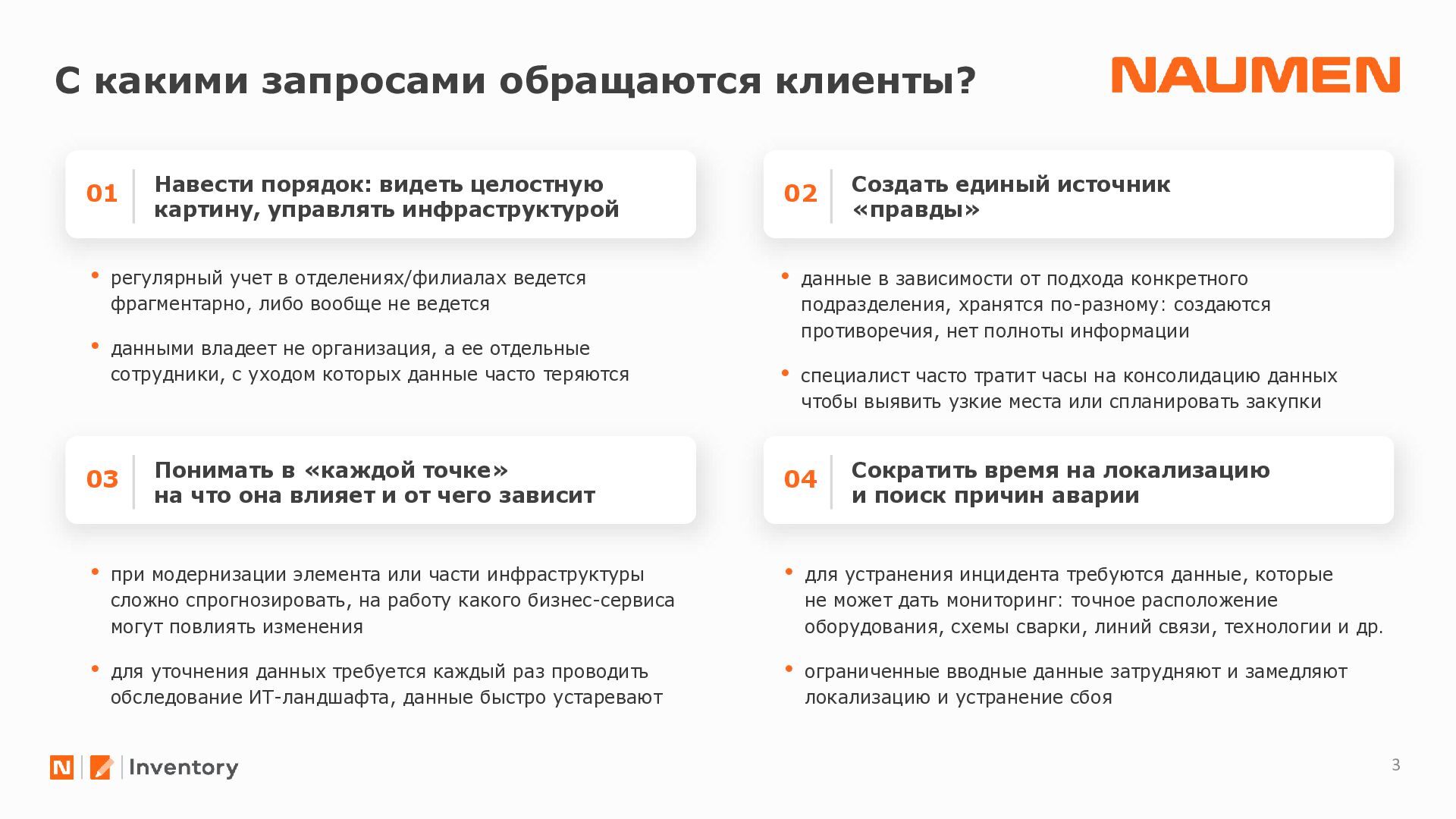 отделениях/филиалах ведется фрагментарно, либо вообще не ведется • данными владеет не организация, а ее отдельные сотрудники, с уходом которых данные часто теряются • данные в зависимости от подхода конкретного подразделения, хранятся по-разному: создаются противоречия, нет полноты информации • специалист часто тратит часы на консолидацию данных чтобы выявить узкие места или спланировать закупки • при модернизации элемента или части инфраструктуры сложно спрогнозировать, на работу какого бизнес-сервиса могут повлиять изменения • для уточнения данных требуется каждый раз проводить обследование ИТ-ландшафта, данные быстро устаревают • для устранения инцидента требуются данные, которые не может дать мониторинг: точное расположение оборудования, схемы сварки, линий связи, технологии и др. • ограниченные вводные данные затрудняют и замедляют локализацию и устранение сбоя Навести порядок: видеть целостную картину, управлять инфраструктурой 01 Создать единый источник «правды» 02 Понимать в «каждой точке» на что она влияет и от чего зависит 03 Сократить время на локализацию и поиск причин аварии 04