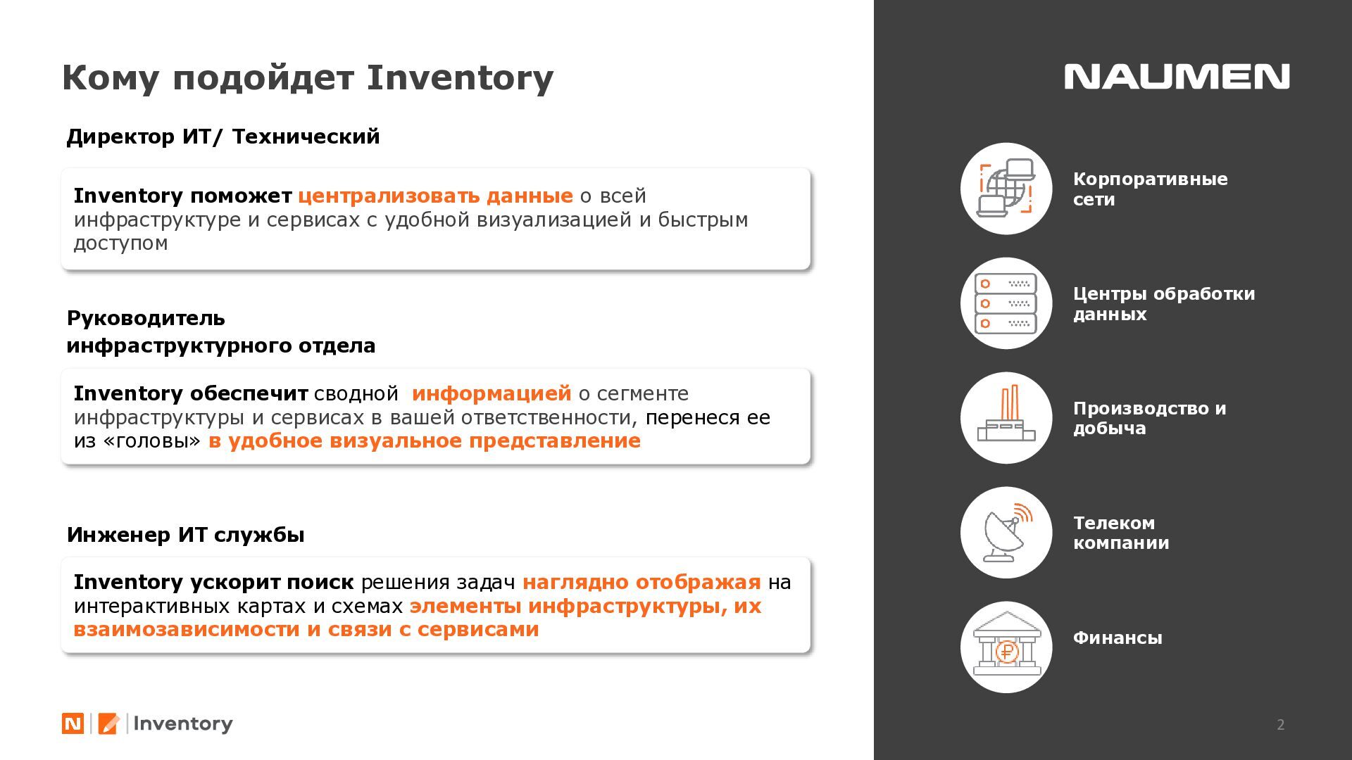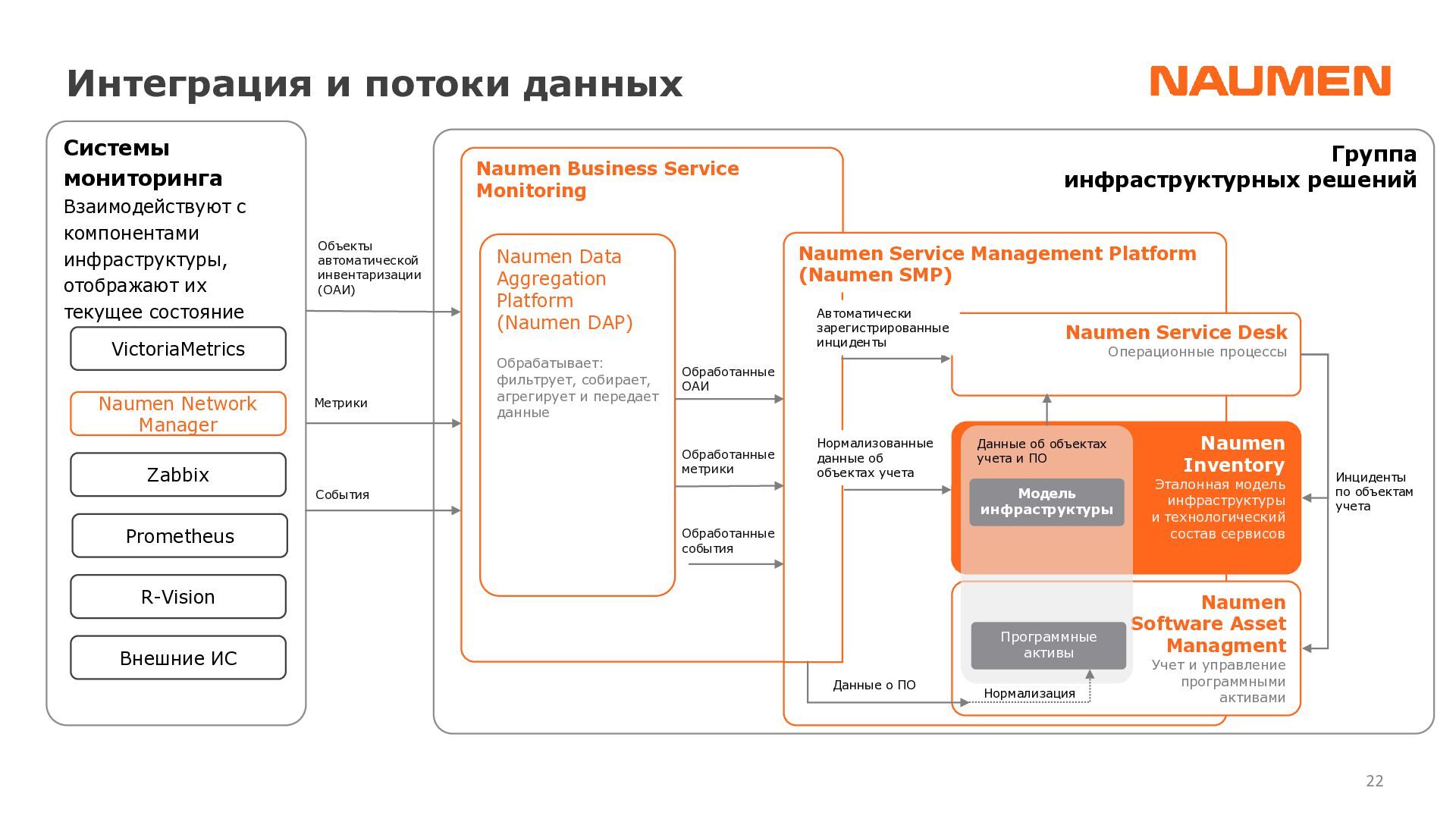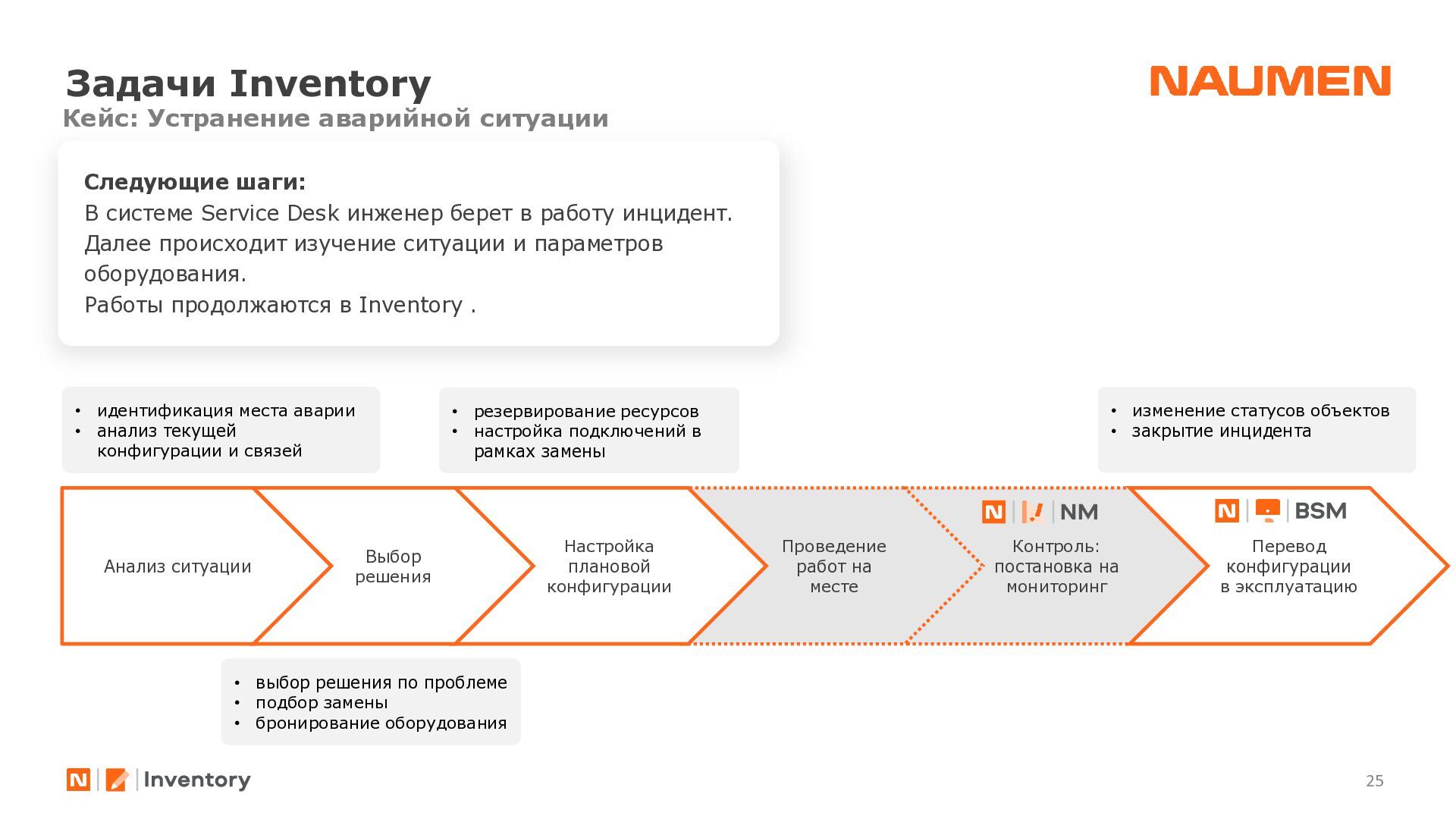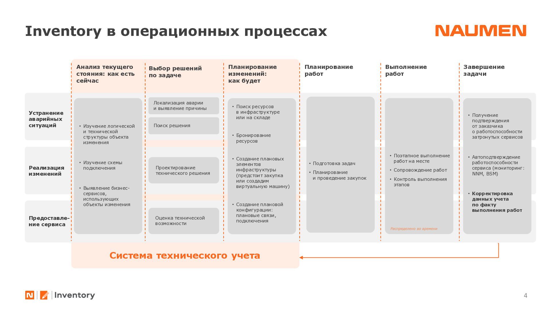 отделениях/филиалах ведется фрагментарно, либо вообще не ведется • данными владеет не организация, а ее отдельные сотрудники, с уходом которых данные часто теряются • данные в зависимости от подхода конкретного подразделения, хранятся по-разному: создаются противоречия, нет полноты информации • специалист часто тратит часы на консолидацию данных чтобы выявить узкие места или спланировать закупки • при модернизации элемента или части инфраструктуры сложно спрогнозировать, на работу какого бизнес-сервиса могут повлиять изменения • для уточнения данных требуется каждый раз проводить обследование ИТ-ландшафта, данные быстро устаревают • для устранения инцидента требуются данные, которые не может дать мониторинг: точное расположение оборудования, схемы сварки, линий связи, технологии и др. • ограниченные вводные данные затрудняют и замедляют локализацию и устранение сбоя Навести порядок: видеть целостную картину, управлять инфраструктурой 01 Создать единый источник «правды» 02 Понимать в «каждой точке» на что она влияет и от чего зависит 03 Сократить время на локализацию и поиск причин аварии 04