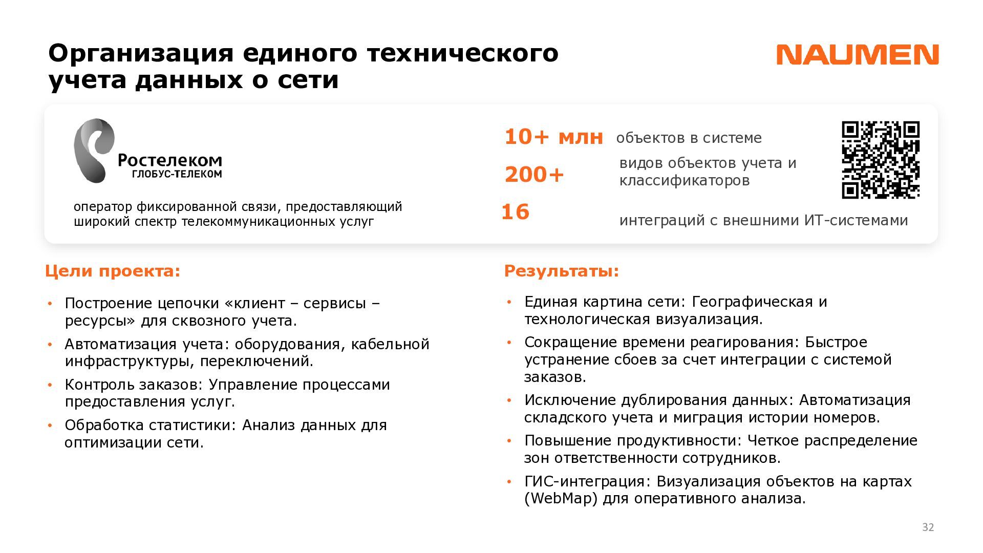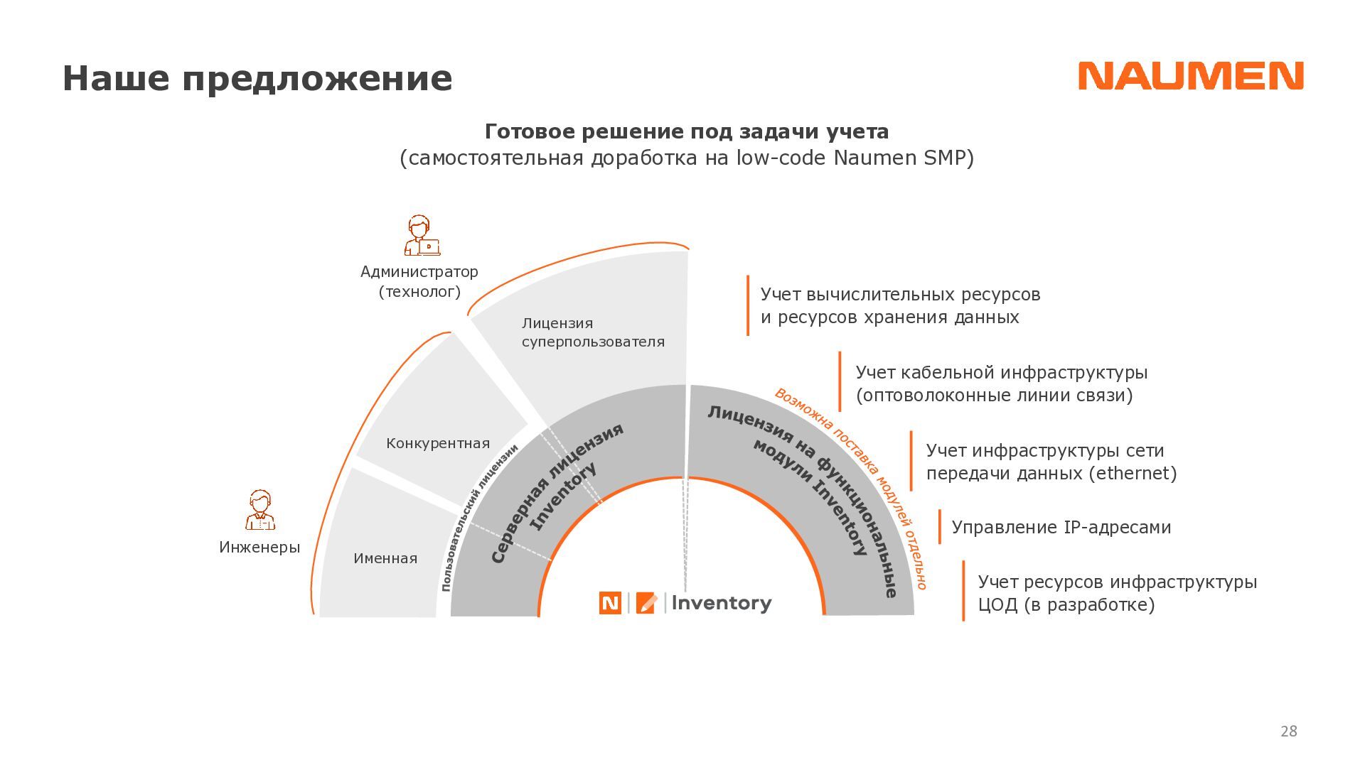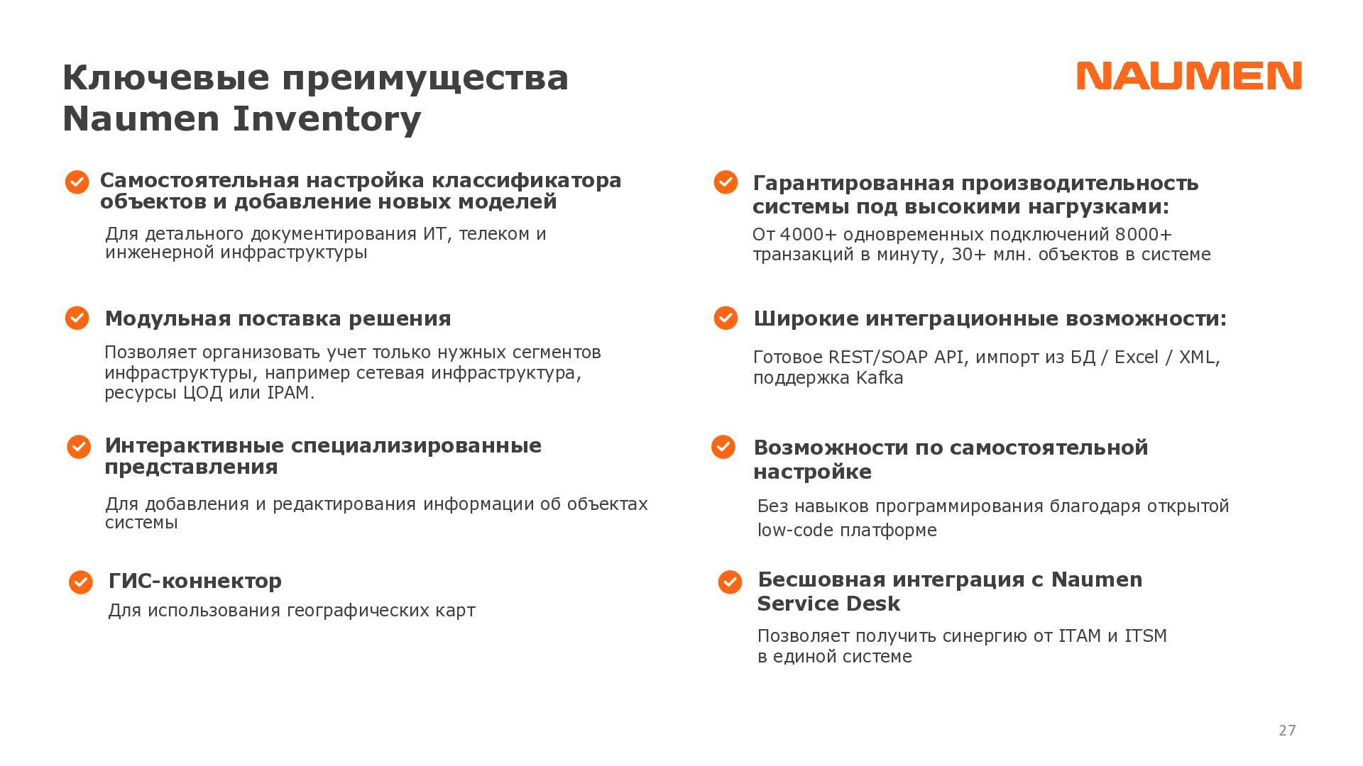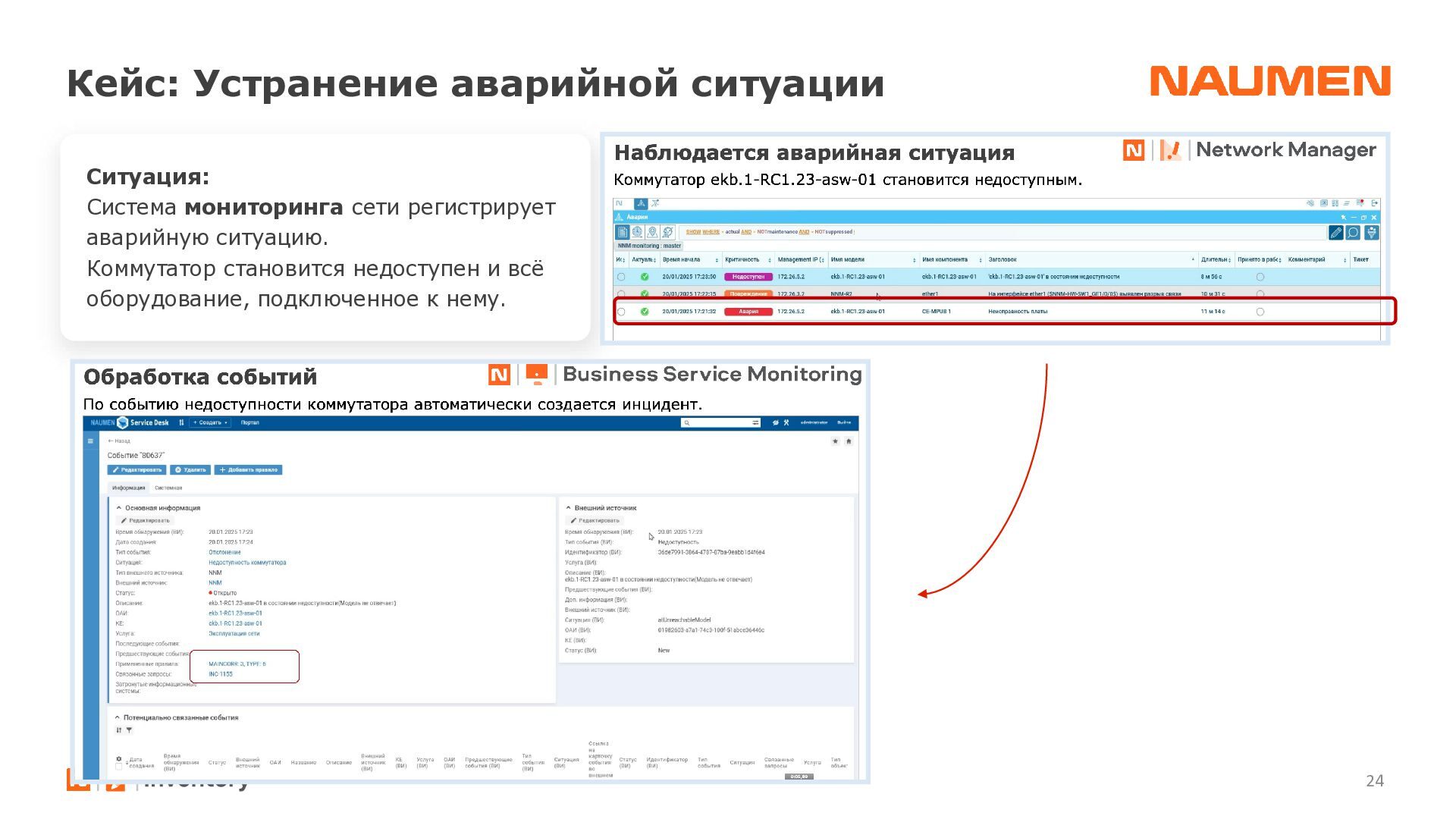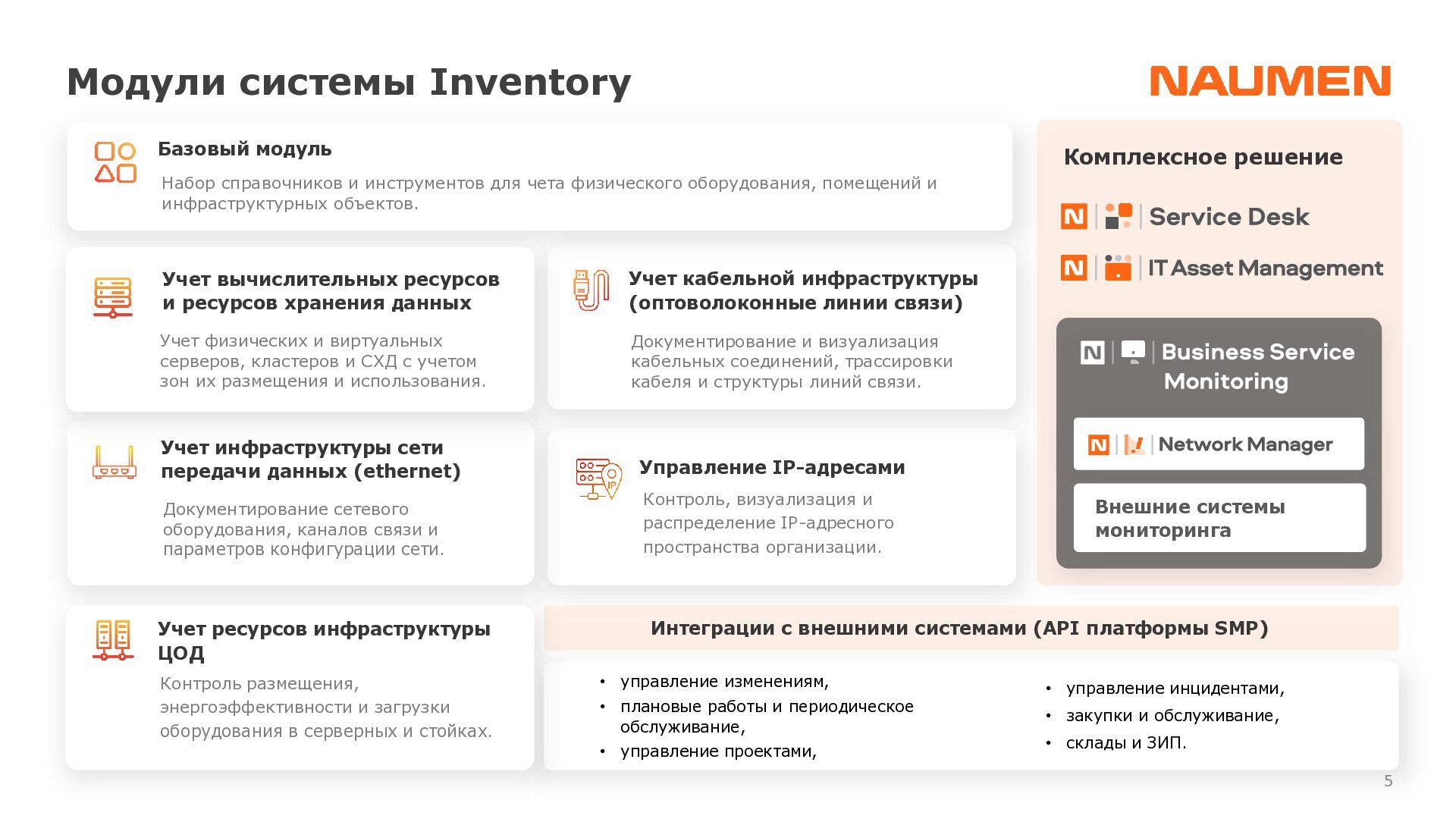 отделениях/филиалах ведется фрагментарно, либо вообще не ведется • данными владеет не организация, а ее отдельные сотрудники, с уходом которых данные часто теряются • данные в зависимости от подхода конкретного подразделения, хранятся по-разному: создаются противоречия, нет полноты информации • специалист часто тратит часы на консолидацию данных чтобы выявить узкие места или спланировать закупки • при модернизации элемента или части инфраструктуры сложно спрогнозировать, на работу какого бизнес-сервиса могут повлиять изменения • для уточнения данных требуется каждый раз проводить обследование ИТ-ландшафта, данные быстро устаревают • для устранения инцидента требуются данные, которые не может дать мониторинг: точное расположение оборудования, схемы сварки, линий связи, технологии и др. • ограниченные вводные данные затрудняют и замедляют локализацию и устранение сбоя Навести порядок: видеть целостную картину, управлять инфраструктурой 01 Создать единый источник «правды» 02 Понимать в «каждой точке» на что она влияет и от чего зависит 03 Сократить время на локализацию и поиск причин аварии 04