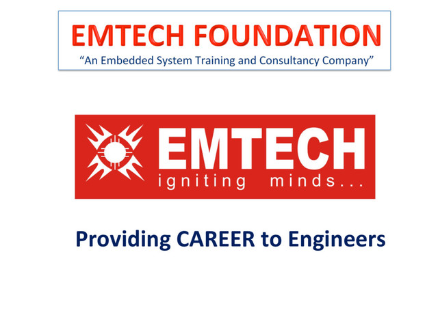 Founda0on is wonderful. It offers incredible combina0on latest training techniques, infrastructure and requisite so] skills programs.” Anant ,Aricent Technologies(Gurgaon) “I am falling short of words to express my gra0tude towards Emtech Founda0on for enlightening me with valuable knowledge in the category of Embedded Systems and solu0ons. “ -‐ Navneet Dahiya ,Bosch (Bangalore)