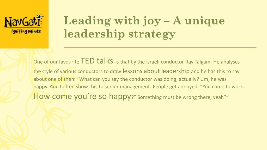 Leading with joy – A unique leadership strategy-Navgati is a leading provider of innovative learning and coaching interventions, aimed at improving the performance of organisations and adding value to people’s lives(https://www.navgati.in/)