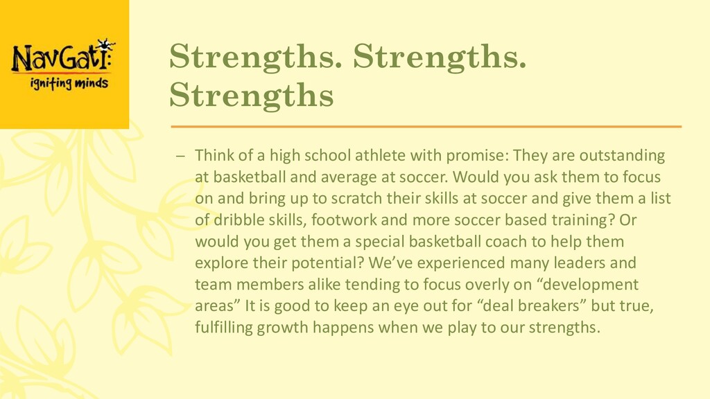 with promise: They are outstanding at basketball and average at soccer. Would you ask them to focus on and bring up to scratch their skills at soccer and give them a list of dribble skills, footwork and more soccer based training? Or would you get them a special basketball coach to help them explore their potential? We’ve experienced many leaders and team members alike tending to focus overly on “development areas” It is good to keep an eye out for “deal breakers” but true, fulfilling growth happens when we play to our strengths.