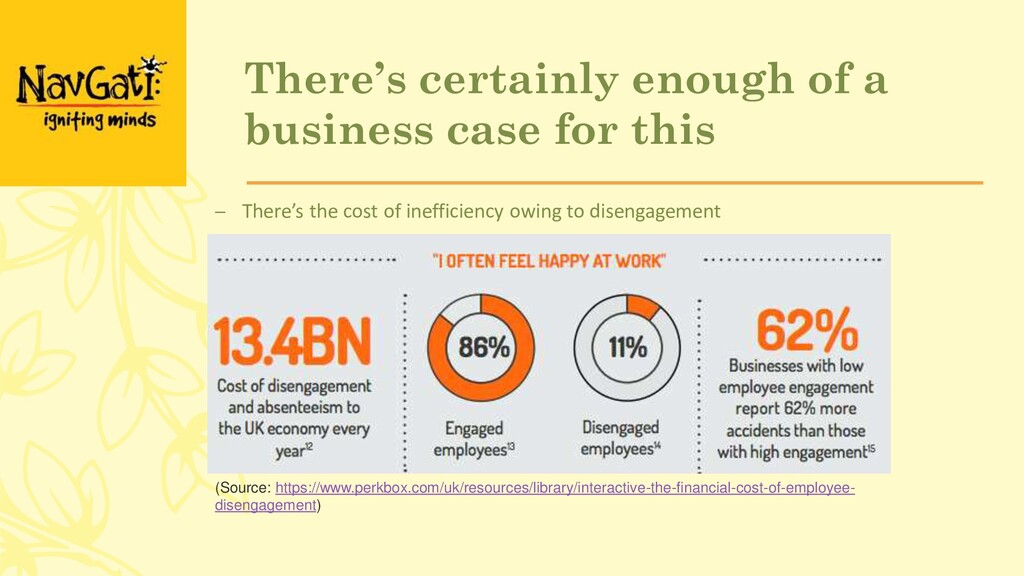 There’s the cost of inefficiency owing to disengagement (Source: https://www.perkbox.com/uk/resources/library/interactive-the-financial-cost-of-employee- disengagement)