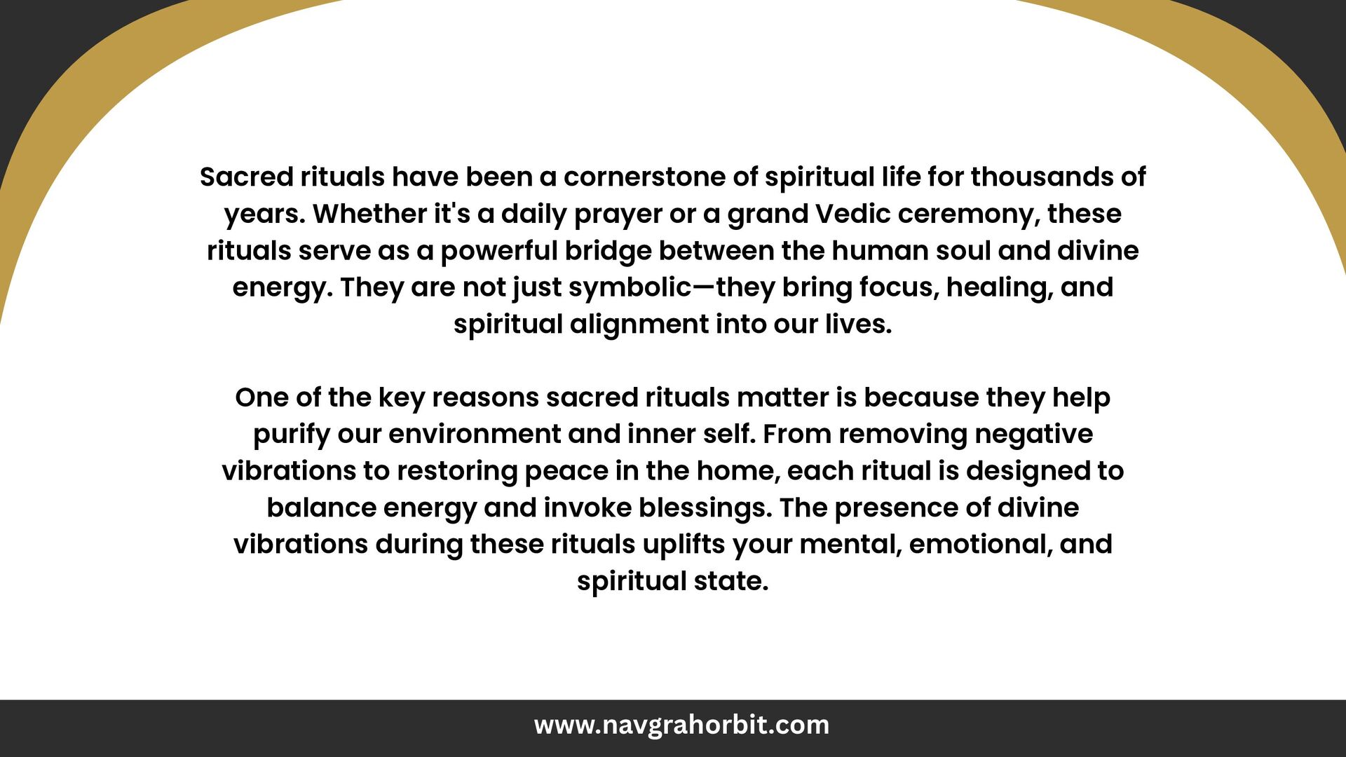 thousands of years. Whether it's a daily prayer or a grand Vedic ceremony, these rituals serve as a powerful bridge between the human soul and divine energy. They are not just symbolic—they bring focus, healing, and spiritual alignment into our lives. One of the key reasons sacred rituals matter is because they help purify our environment and inner self. From removing negative vibrations to restoring peace in the home, each ritual is designed to balance energy and invoke blessings. The presence of divine vibrations during these rituals uplifts your mental, emotional, and spiritual state. www.navgrahorbit.com
