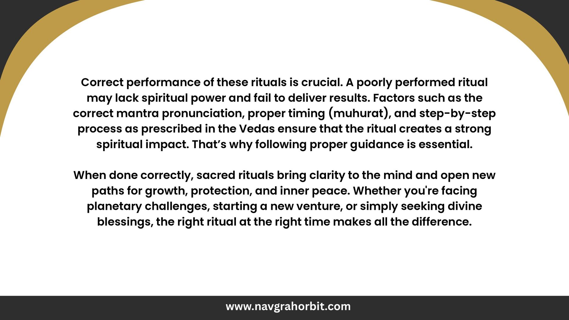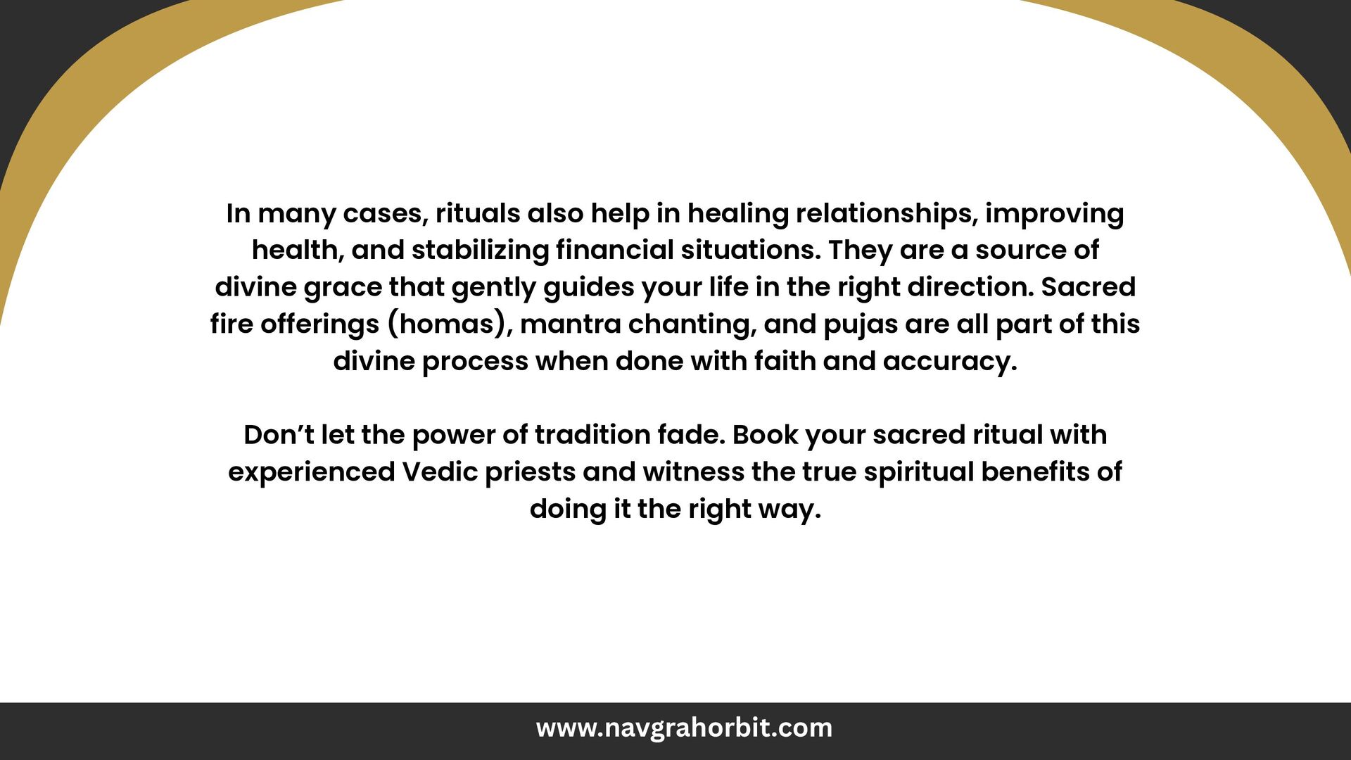 ritual may lack spiritual power and fail to deliver results. Factors such as the correct mantra pronunciation, proper timing (muhurat), and step-by-step process as prescribed in the Vedas ensure that the ritual creates a strong spiritual impact. That’s why following proper guidance is essential. When done correctly, sacred rituals bring clarity to the mind and open new paths for growth, protection, and inner peace. Whether you're facing planetary challenges, starting a new venture, or simply seeking divine blessings, the right ritual at the right time makes all the difference. www.navgrahorbit.com