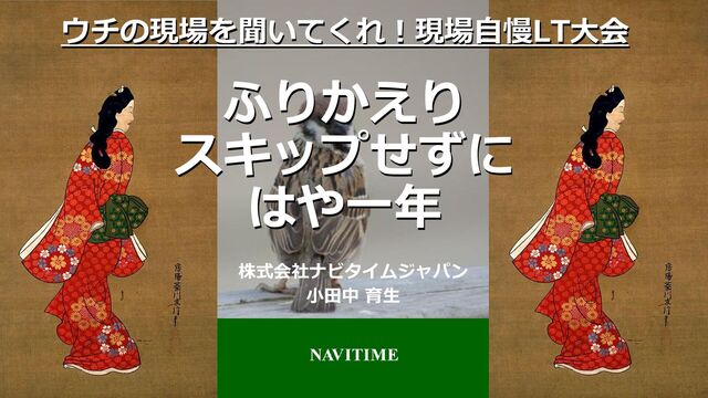 ウチの現場を聞いてくれ!現場自慢LT大会 ふりかえり スキップせずに はや一年 ウチの現場を聞いてくれ!現場自慢LT大会 ふりかえり スキップせずに はや一年 株式会社ナビタイムジャパン 小田中