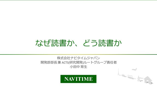 ©NAVITIME JAPAN なぜ読書か、どう読書か 株式会社ナビタイムジャパン 開発部部長 兼 ACTS(研究開発)ルートグループ責任者 小田中 育生