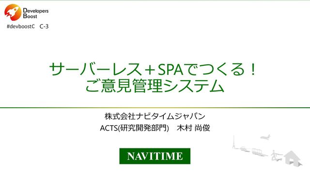 CONFIDENTIAL ©NAVITIME JAPAN サーバーレス+SPAでつくる! ご意見管理システム 株式会社ナビタイムジャパン ACTS(研究開発部門) 木村 尚俊 C-3