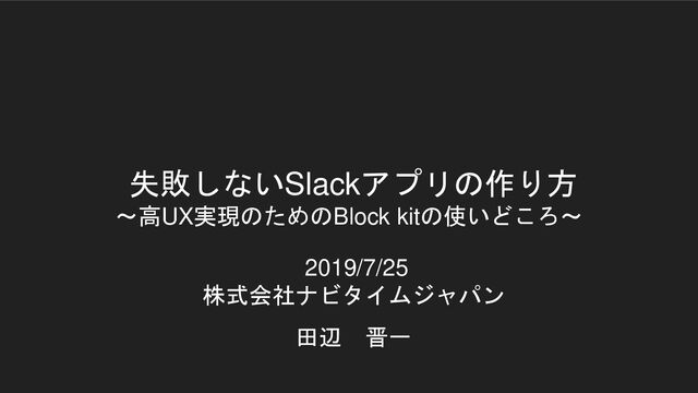 失敗しないSlackアプリの作り方 ~高UX実現のためのBlock kitの使いどころ~ 2019/7/25 株式会社ナビタイムジャパン 田辺 晋一
