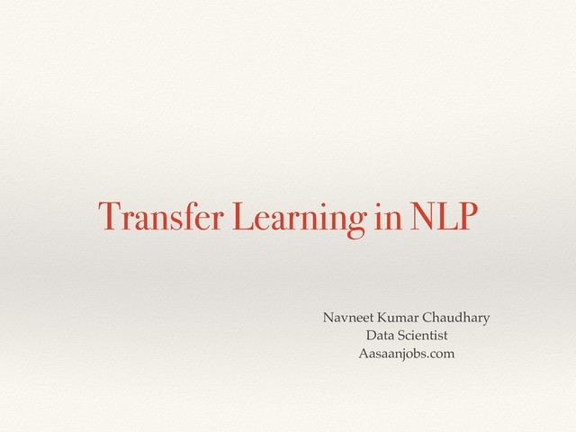 This is a MeetUp talk on the topic of Transfer Learning in NLP and how the recent State of the Arts models were able to extend the idea of transfer learning from Computer Vision datasets to NLP.