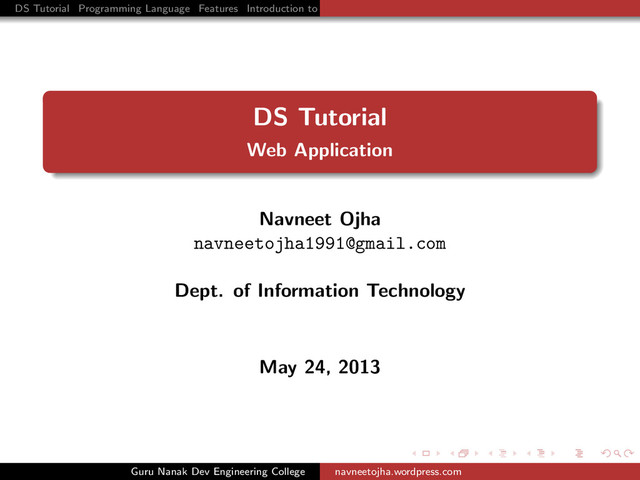 SnapShots Introduction Introduction DS Tutorial is general purpose web application which deals with engneering and all other student who want to be a programmer.DS Tutorial will make all the student to learn the difficult concepts Data Structure through animations,videos and books.DS Tutorial simply deals with Data Structures and programming methodology. Guru Nanak Dev Engineering College navneetojha.wordpress.com