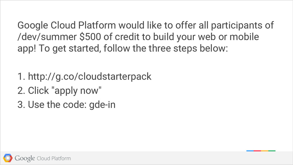 /dev/summer $500 of credit to build your web or mobile app! To get started, follow the three steps below: 1. http://g.co/cloudstarterpack 2. Click "apply now" 3. Use the code: gde-in