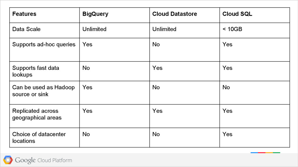 < 10GB Supports ad-hoc queries Yes No Yes Supports fast data lookups No Yes Yes Can be used as Hadoop source or sink Yes No No Replicated across geographical areas Yes Yes Yes Choice of datacenter locations No No Yes