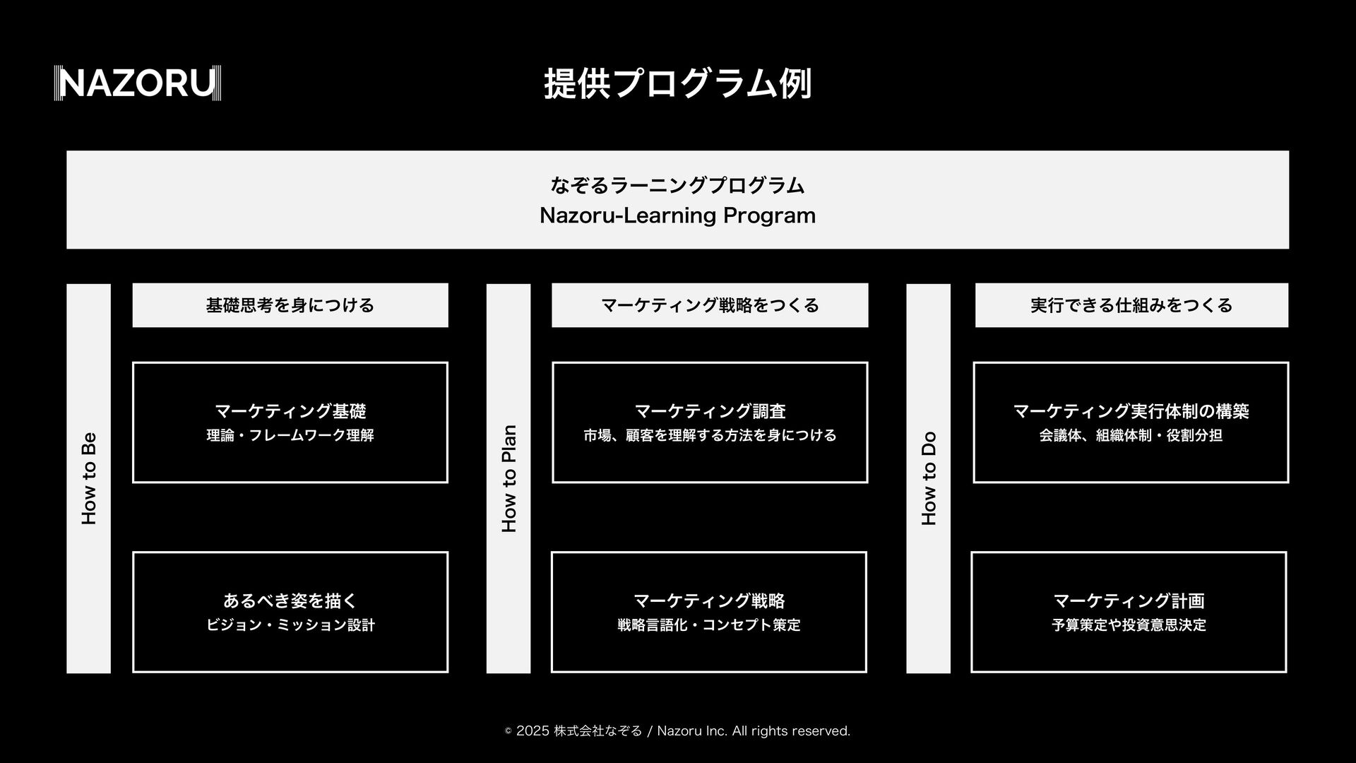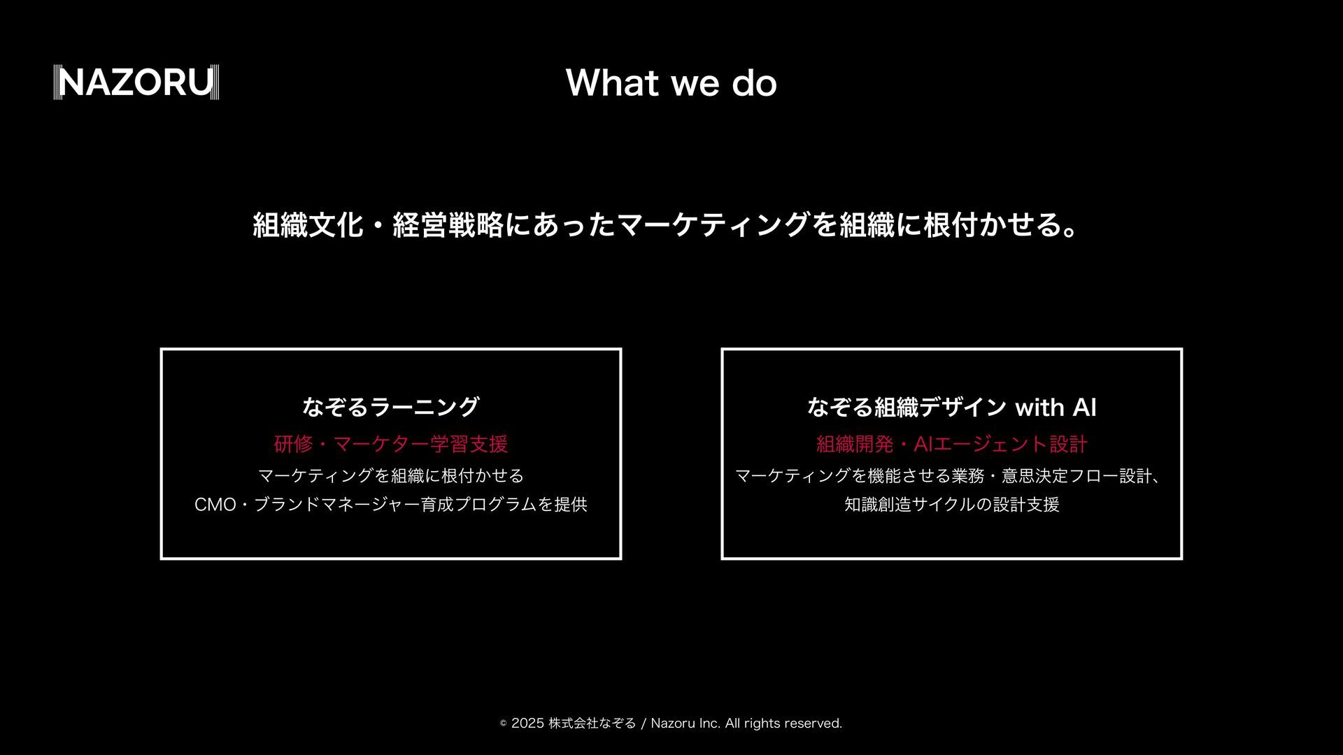 גࣜձࣾͳͧΔ/B[PSV*OD"MMSJHIUTSFTFSWFE ͳͧΔϥʔχϯά ݚमɾϚʔέλʔֶशࢧԉ ϚʔέςΟϯάΛ৫ʹ͔ࠜͤΔ $.0ɾϒϥϯυϚωʔδϟʔҭϓϩάϥϜΛఏڙ ͳͧΔ৫σβΠϯXJUI"* ৫։ൃɾ"*ΤʔδΣϯτઃܭ ϚʔέςΟϯάΛػೳͤ͞Δۀɾҙࢥܾఆϑϩʔઃܭɺ ࣝαΠΫϧͷઃܭࢧԉ ৫จԽɾܦӦઓུʹ͋ͬͨϚʔέςΟϯάΛ৫ʹ͔ࠜͤΔɻ