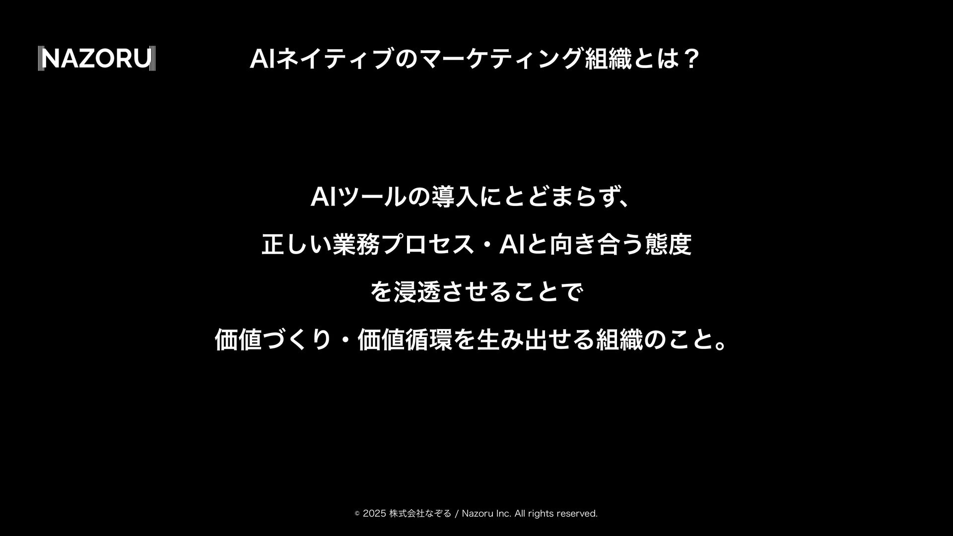 גࣜձࣾͳͧΔ/B[PSV*OD"MMSJHIUTSFTFSWFE "*ωΠςΟϒͷϚʔέςΟϯά৫ͱʁ "*πʔϧͷಋೖʹͱͲ·Βͣɺ ਖ਼͍͠ۀϓϩηεɾ"*ͱ͖߹͏ଶ Λਁಁͤ͞Δ͜ͱͰ Ձͮ͘ΓɾՁ॥ΛੜΈग़ͤΔ৫ͷ͜ͱɻ