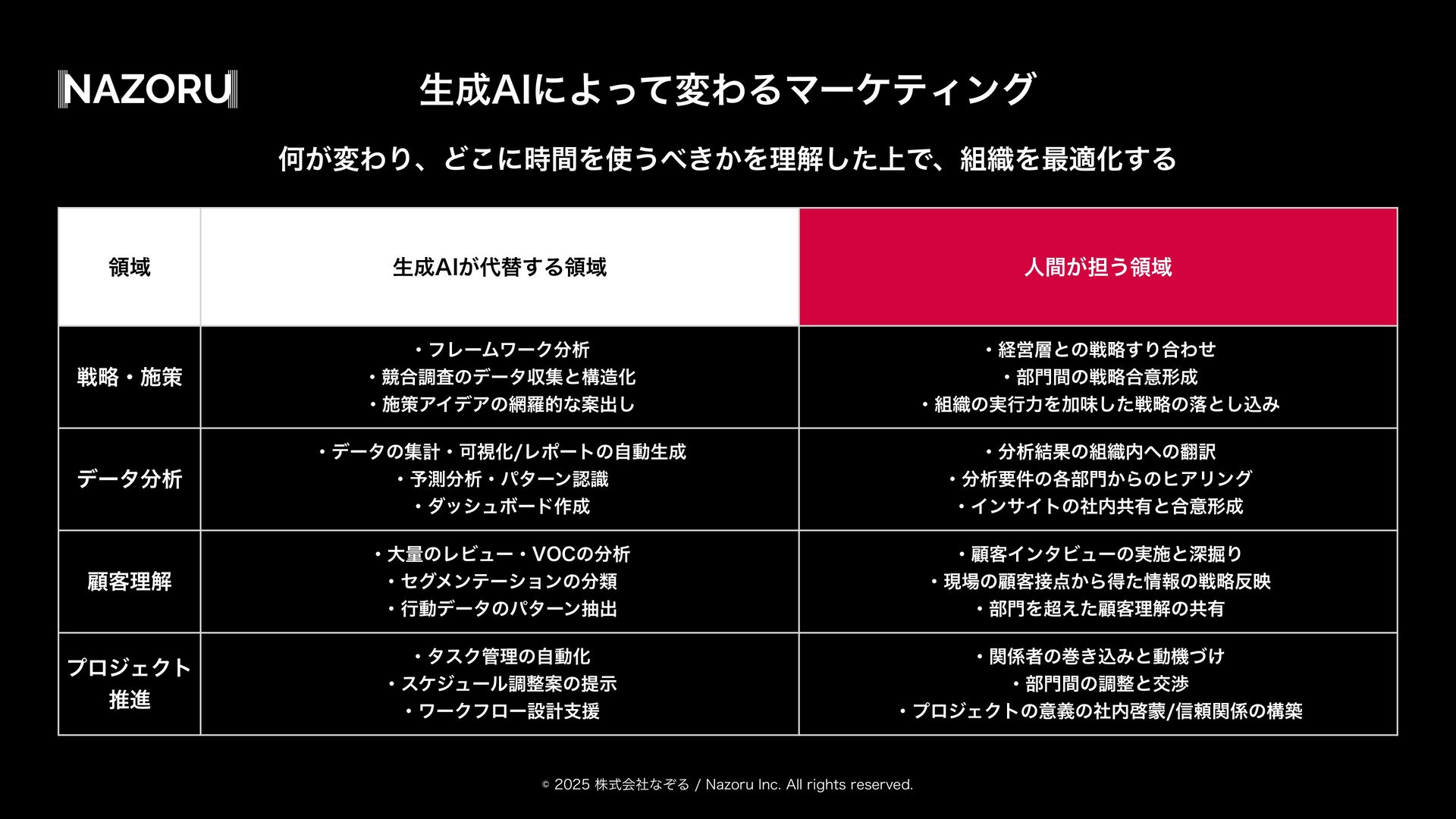 גࣜձࣾͳͧΔ/B[PSV*OD"MMSJHIUTSFTFSWFE ྖҬ ੜ"*͕ସ͢ΔྖҬ ਓ͕ؒ୲͏ྖҬ ઓུɾࢪࡦ ɾϑϨʔϜϫʔΫੳ ɾڝ߹ௐࠪͷσʔλऩूͱߏԽ ɾࢪࡦΞΠσΞͷཏతͳҊग़͠ ɾܦӦͱͷઓུ͢Γ߹Θͤ ɾ෦ؒͷઓུ߹ҙܗ