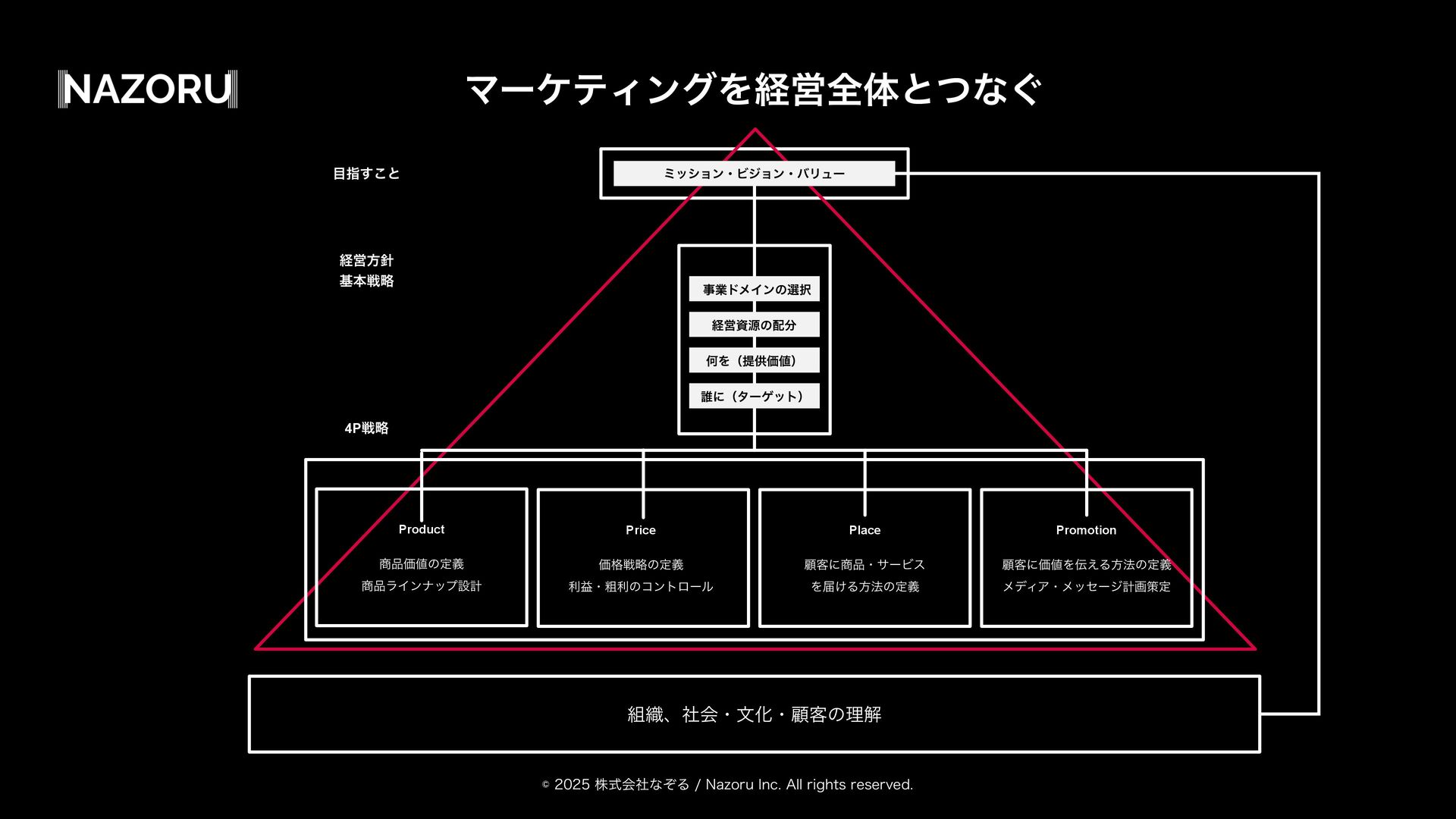 גࣜձࣾͳͧΔ/B[PSV*OD"MMSJHIUTSFTFSWFE 4Pઓུ ϚʔέςΟϯάΛܦӦશମͱͭͳ͙ ϛογϣϯɾϏδϣϯɾόϦϡʔ ԿΛʢఏڙՁʣ ୭ʹʢλʔήοτʣ ࣄۀυϝΠϯͷબ ܦӦࢿݯͷ Product Ձͷఆٛ
