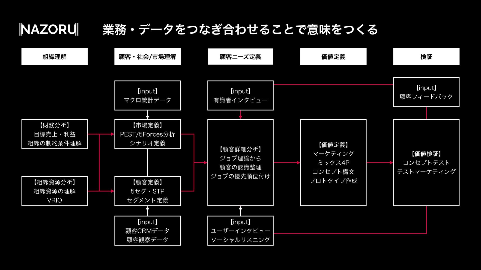 ඪച্ɾརӹ ৫ͷ੍݅ཧղ ʲސ٬ৄࡉੳʳ δϣϒཧ͔Β ސ٬ͷೝࣝཧ δϣϒͷ༏ઌॱҐ͚ ʲՁఆٛʳ ϚʔέςΟϯά ϛοΫε1 ίϯηϓτߏจ ϓϩτλΠϓ࡞ ʲJOQVUʳ ސ٬$3.σʔλ ސ٬؍σʔλ ʲՁݕূʳ ίϯηϓτςετ ςετϚʔέςΟϯά ʲ৫ࢿݯੳʳ ৫ࢿݯͷཧղ 73*0 ʲJOQVUʳ ϢʔβʔΠϯλϏϡʔ ιʔγϟϧϦεχϯά ৫ཧղ ސ٬ɾࣾձࢢཧղ ݕূ ʲJOQVUʳ ސ٬ϑΟʔυόοΫ ʲJOQVUʳ ༗ࣝऀΠϯλϏϡʔ ސ٬χʔζఆٛ Ձఆٛ