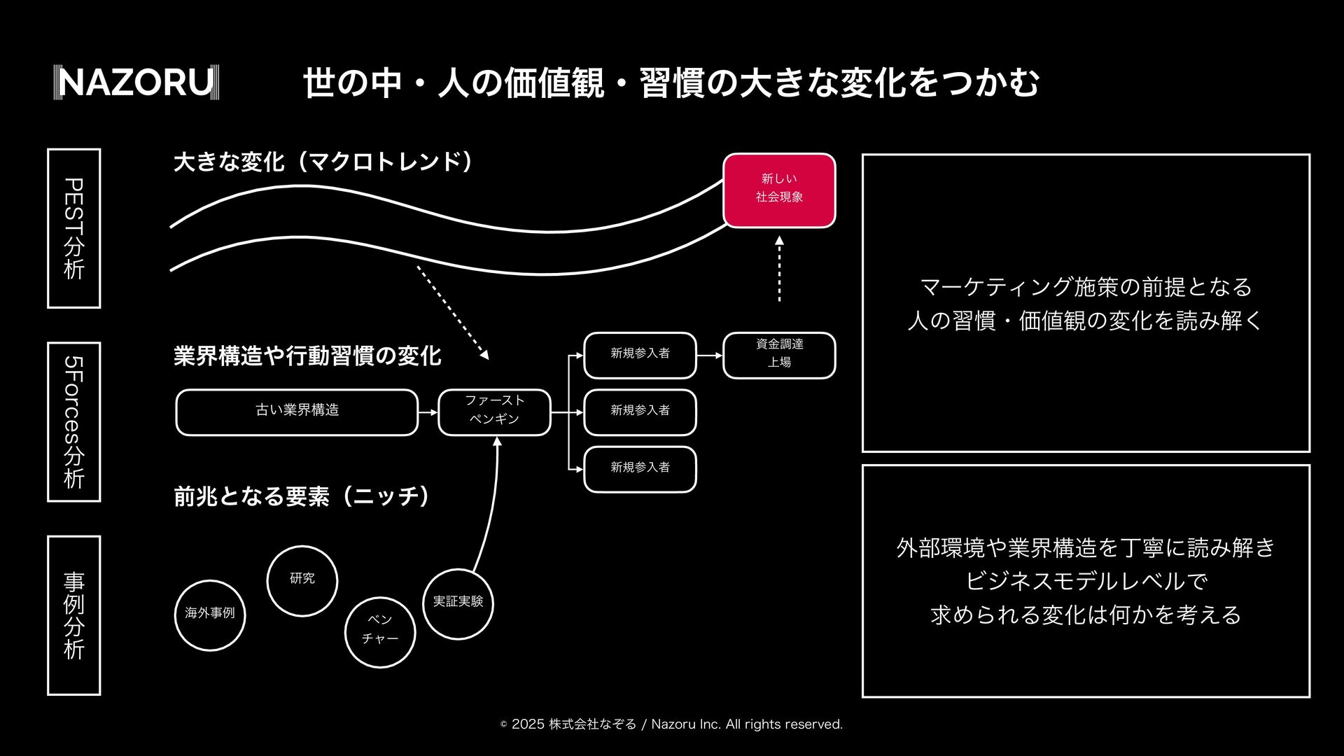 גࣜձࣾͳͧΔ/B[PSV*OD"MMSJHIUTSFTFSWFE ੈͷதɾਓͷՁ؍ɾश׳ͷେ͖ͳมԽΛ͔ͭΉ ֎෦ڥۀքߏΛஸೡʹಡΈղ͖ ϏδωεϞσϧϨϕϧͰ ٻΊΒΕΔมԽԿ͔Λߟ͑Δ ϚʔέςΟϯάࢪࡦͷલఏͱͳΔ ਓͷश׳ɾՁ؍ͷมԽΛಡΈղ͘ ݚڀ ւ֎ࣄྫ ࣮ূ࣮ݧ