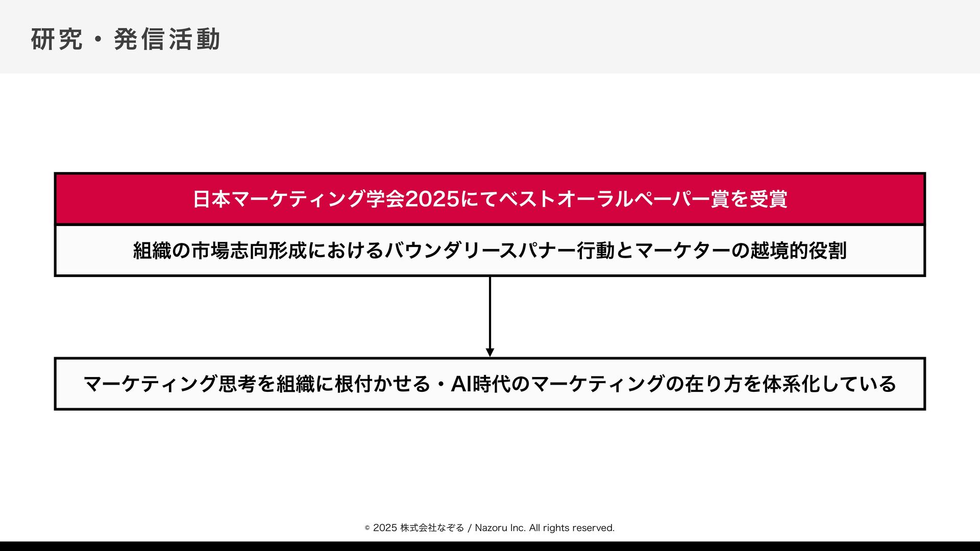 גࣜձࣾͳͧΔ/B[PSV*OD"MMSJHIUTSFTFSWFE ݚڀɾൃ৴׆ಈ ৫ͷࢢࢤܗʹ͓͚ΔόϯμϦʔεύφʔߦಈͱϚʔέλʔͷӽڥతׂ ຊϚʔέςΟϯάֶձʹͯϕετΦʔϥϧϖʔύʔΛड ϚʔέςΟϯάࢥߟΛ৫ʹ͔ࠜͤΔɾ"*࣌ͷϚʔέςΟϯάͷࡏΓํΛମܥԽ͍ͯ͠Δ