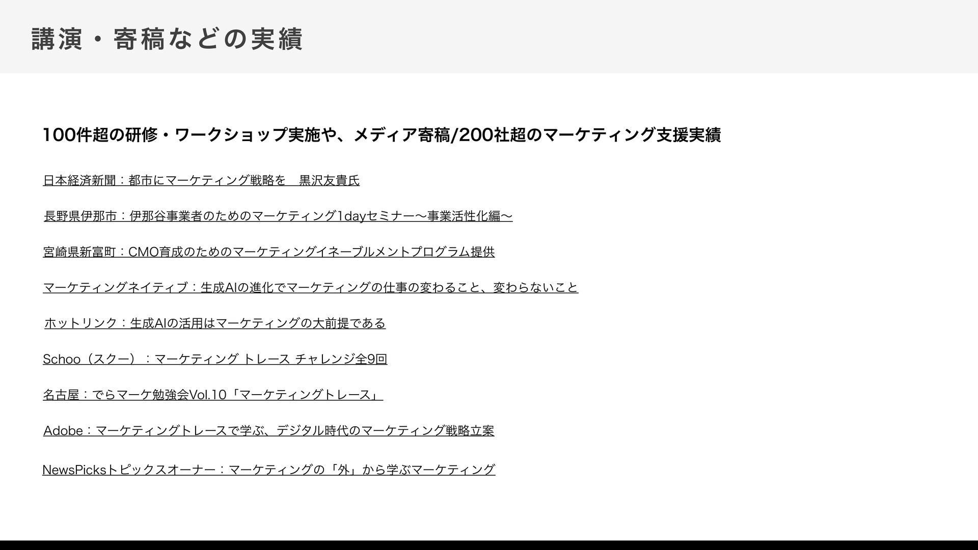 දϓϩϑΟʔϧ_ࠇᖒɹ༑وʢKurosawa Tomokiʣ ɿਆಸݝɾ࡚ࢢੜ·Εɾҭͪ ɿϒϥϯσΟϯάςΫϊϩδʔೖࣾ ɿେࡕӦۀॴʹͯσδλϧϚʔέςΟϯάࣄۀ্ཱͪ͛ ɿ$'0ɾܦӦཧຊ෦ͱ্ͯ͠४උ ɿϚʔέςΟϯάͷֶशίϛϡχςΟϚʔέςΟϯάτϨʔε্ཱͪ͛ ɿॻ੶ɿϚʔέςΟϯάࢥߟྗτϨʔχϯάΛ্Ѹ ɿॻ੶ɿϚʔέλʔͷڭՊॻΛ্Ѹ ɿגࣜձࣾͳͧΔΛઃཱ