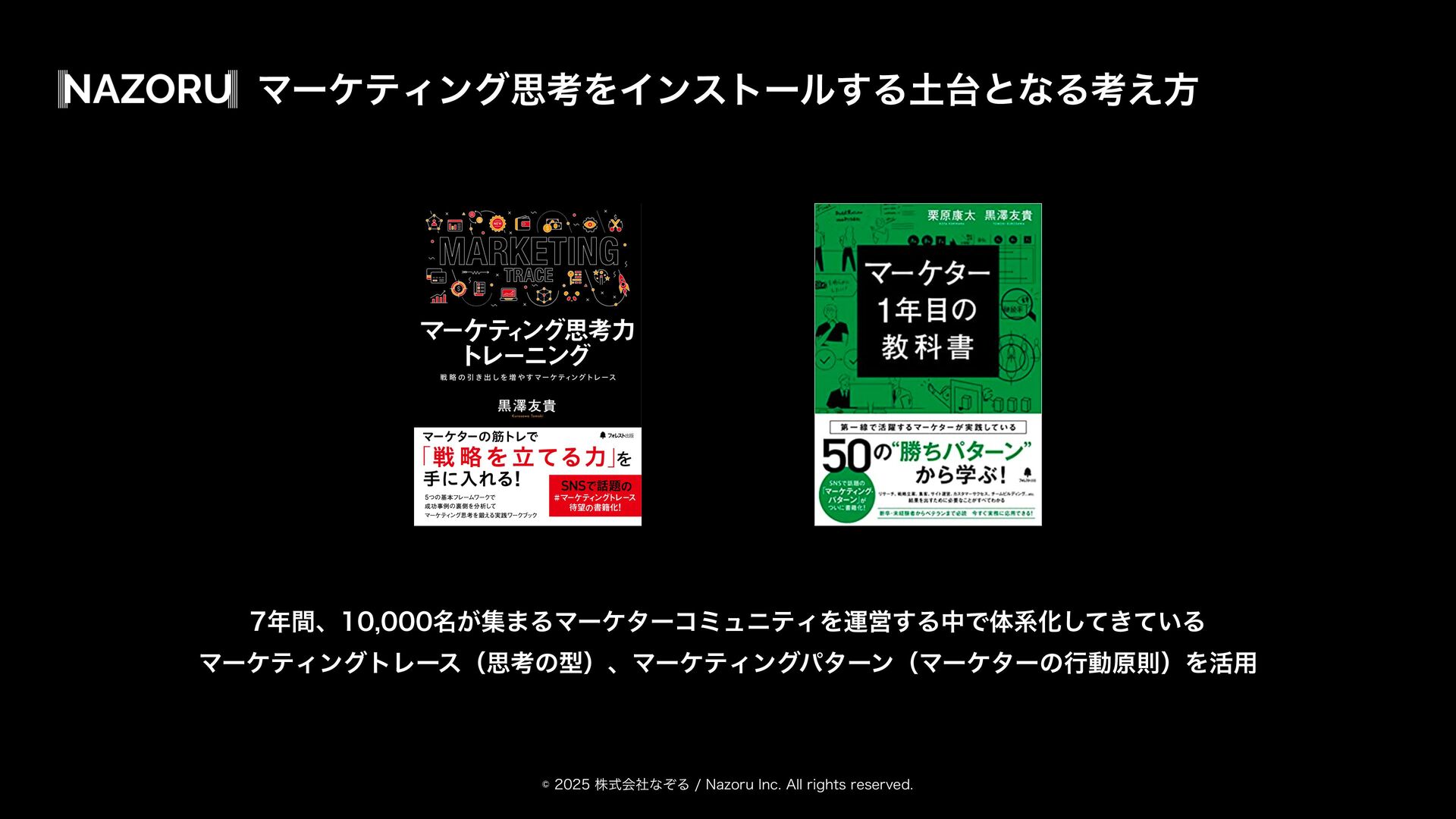 גࣜձࣾͳͧΔ/B[PSV*OD"MMSJHIUTSFTFSWFE ϚʔέςΟϯάࢥߟΛΠϯετʔϧ͢ΔͱͳΔߟ͑ํ ؒɺ ໊͕ू·ΔϚʔέλʔίϛϡχςΟΛӡӦ͢ΔதͰମܥԽ͖͍ͯͯ͠Δ ϚʔέςΟϯάτϨʔεʢࢥߟͷܕʣɺϚʔέςΟϯάύλʔϯʢϚʔέλʔͷߦಈݪଇʣΛ׆༻