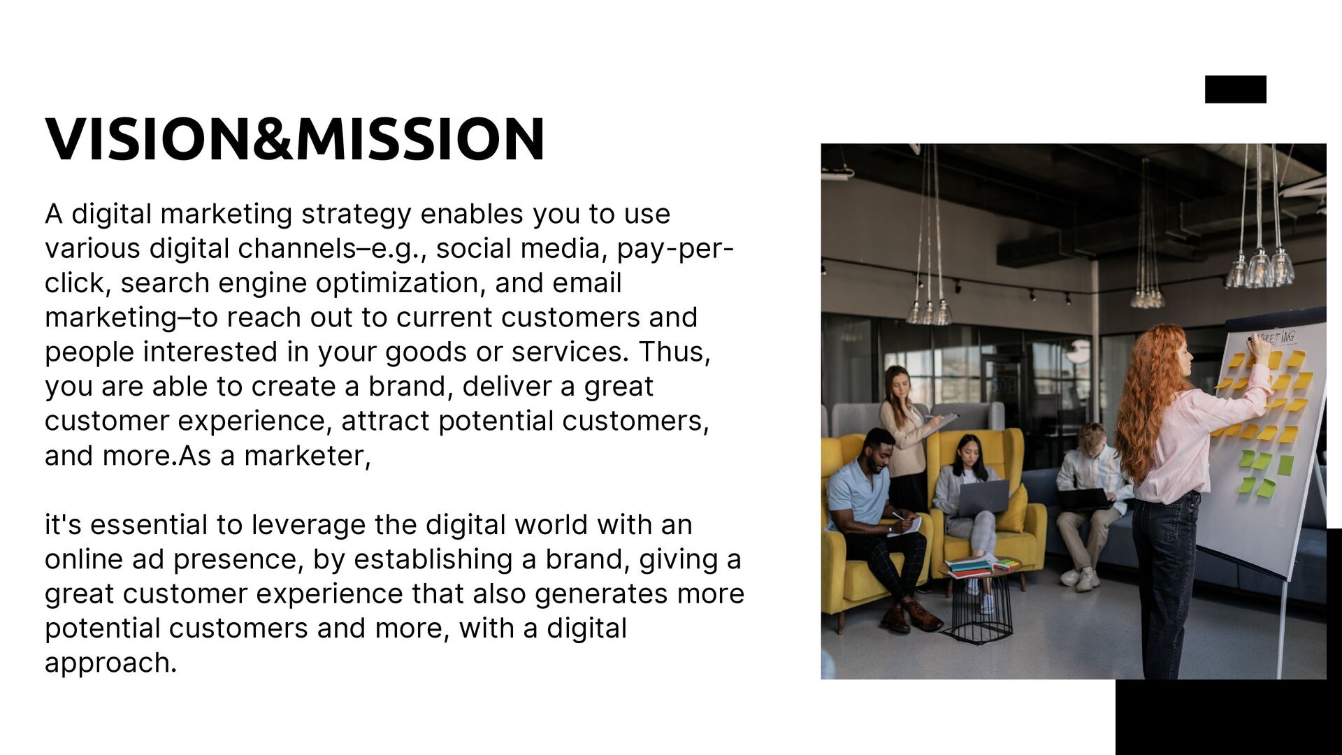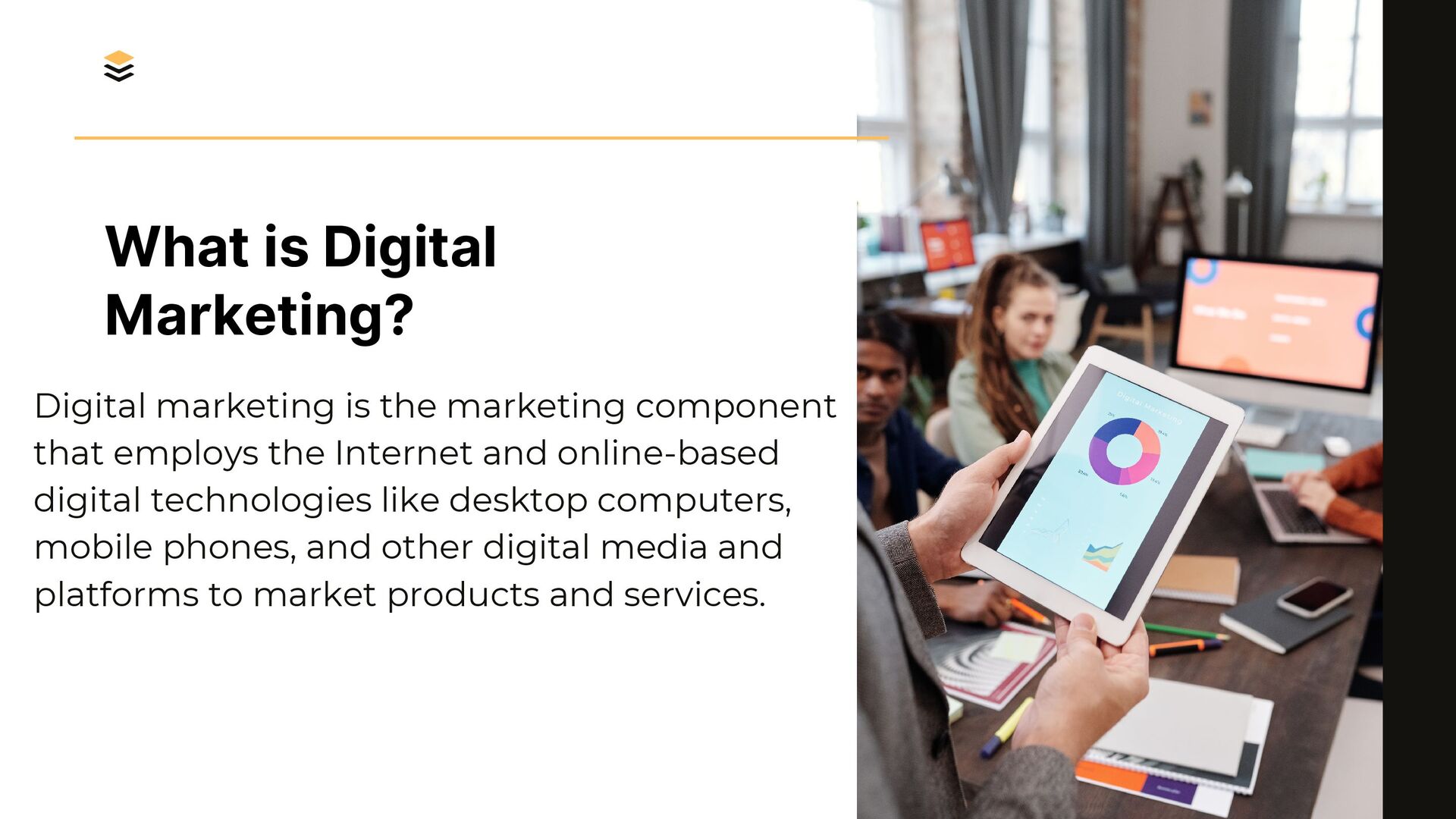 digital channels–e.g., social media, pay-per- click, search engine optimization, and email marketing–to reach out to current customers and people interested in your goods or services. Thus, you are able to create a brand, deliver a great customer experience, attract potential customers, and more.As a marketer, it's essential to leverage the digital world with an online ad presence, by establishing a brand, giving a great customer experience that also generates more potential customers and more, with a digital approach.